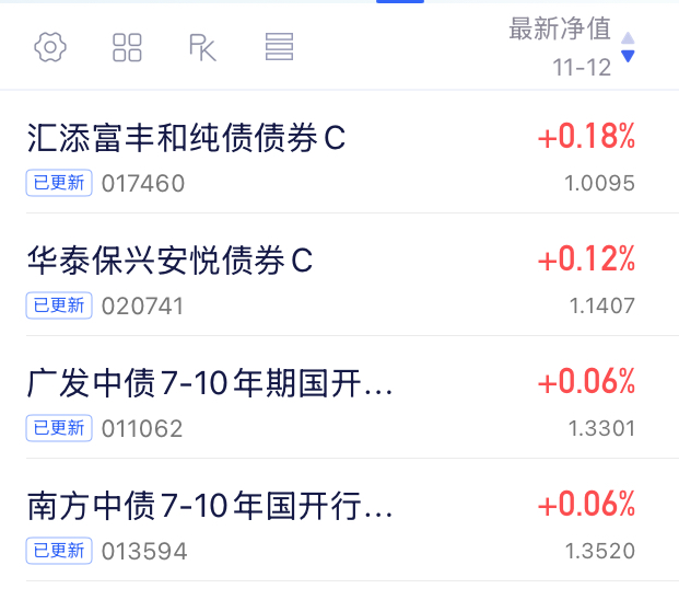 今天债券行情不错,利率债盘中涨幅拉升了不少,信用债相对可以,整体行情是收蛋吃肉的,感觉年末债券持续回暖了,一起来看看净值情况吧!