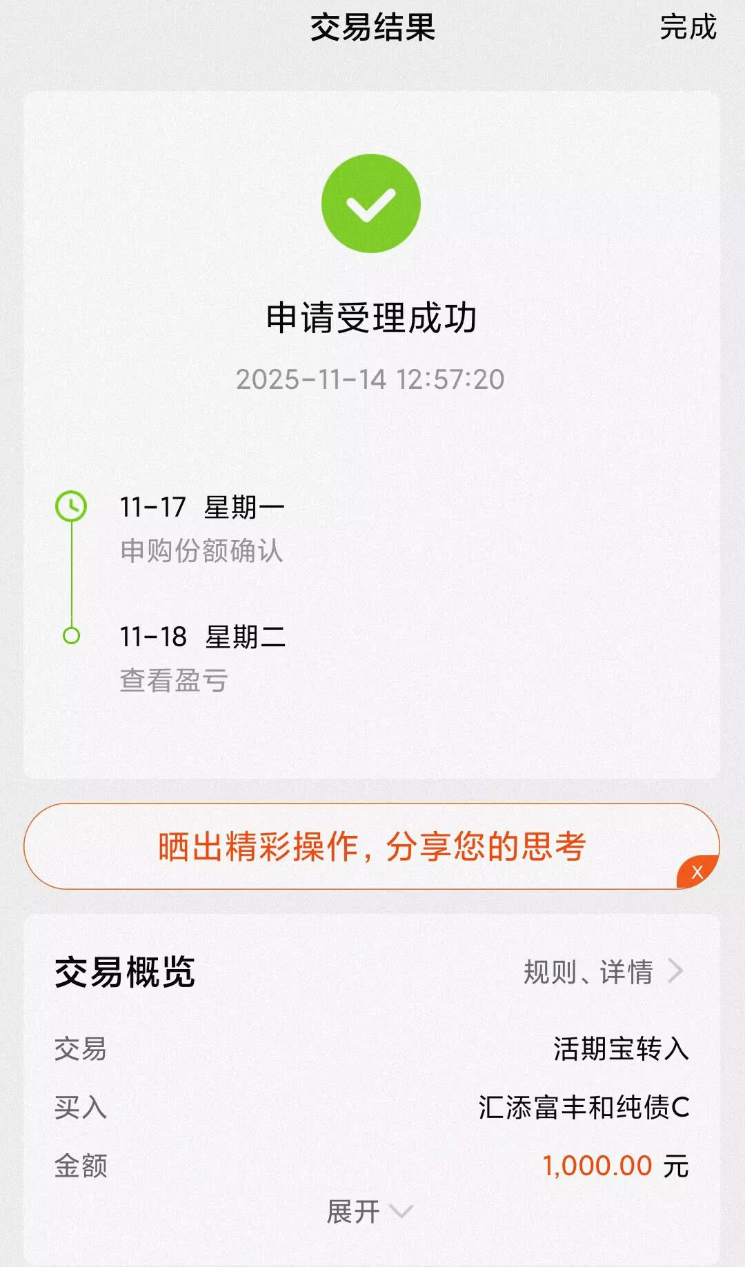 加仓1000元$汇添富丰和纯债C(OTCFUND|017460)$ 最近一段时间A股呈现反复震荡的走势,虽然上证指数刷新了10年新高,但是板块轮动加快,想要精准把握板块轮动并非易事,股市赚钱效应并不高,不过相对于股市的震荡来说,债市却逐渐企稳,以汇添富丰和纯债为例,该基金聚焦30年超长期利率债,弹性更大,在债市回暖时表现突出,近一个月累计收蛋186个,表现十分优秀,我感觉可以将其和股票基金做一个对冲,降低股票基金波动,在岁末年初的时候做一些波段操作也不错,今天决定加仓1000元。