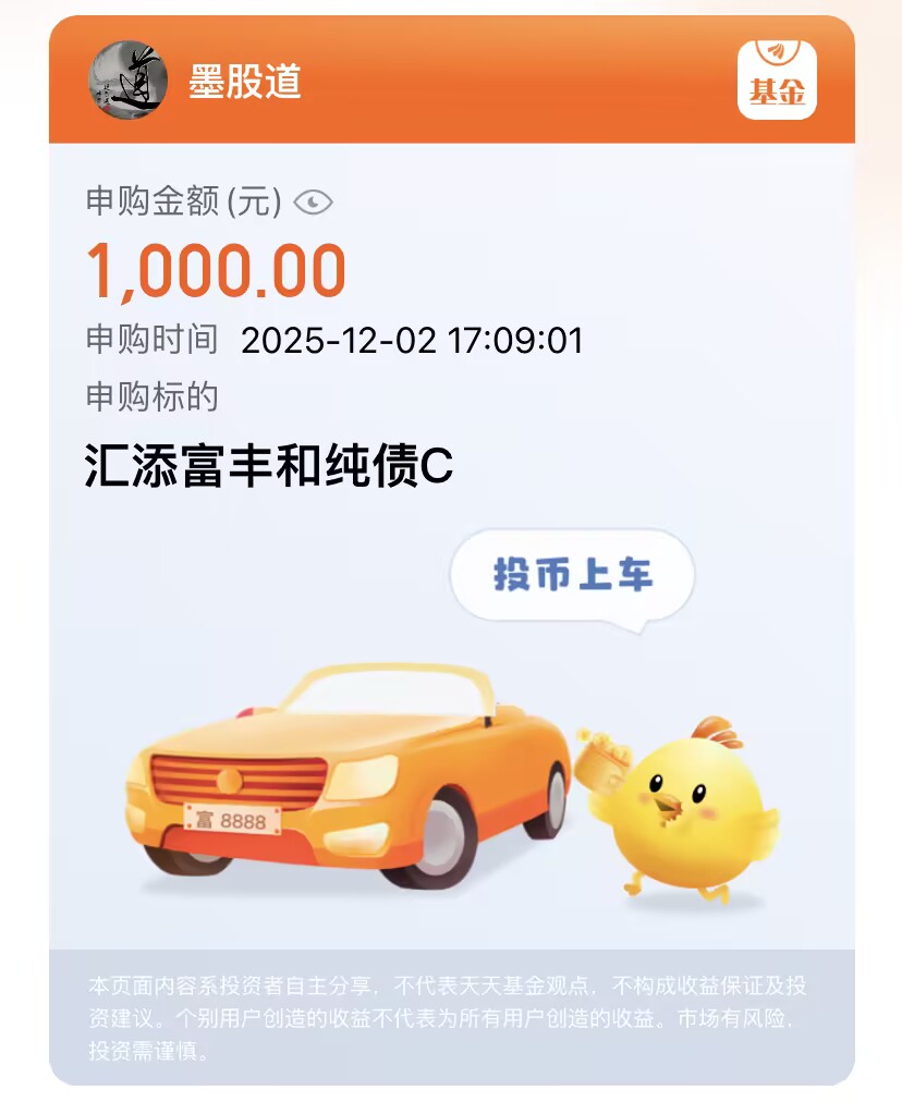 说白了就是每调买机,短期波动别怕,最后都能涨回来。今天我准备加仓$汇添富丰和纯债C(OTCFUND|017460)$这只基金专做利率债,不碰股票,波动特别小。毕竟30年超长债,前段时间业绩比$华泰保兴安悦债券C(OTCFUND|020741)$和$方正富邦鸿远债券C(OTCFUND|015909)$都香,表现特别亮眼。当前资金面宽松,债市整体平稳,就算短期波动也能很快修复。股市震荡时,加配债券能平衡组合风险,趁现在债市调整,年底先加仓一笔,博一波反弹,稳稳当当的。