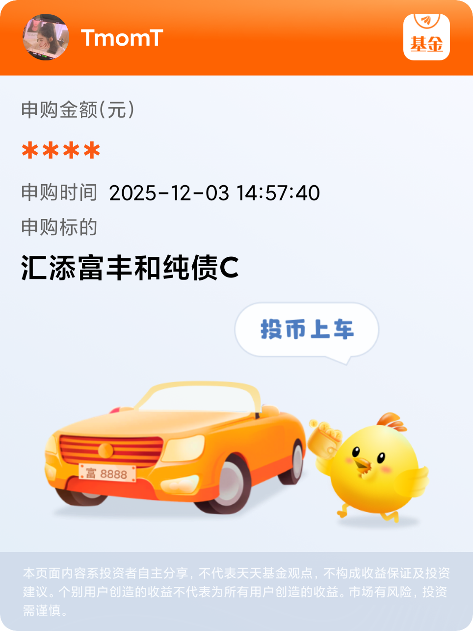 有闲钱随时可加,反正闲钱放着也是放着,岁末年初债市仍有不少交易性机会,可以将$汇添富丰和纯债C$ 作为交易型工具,根据行情低买高