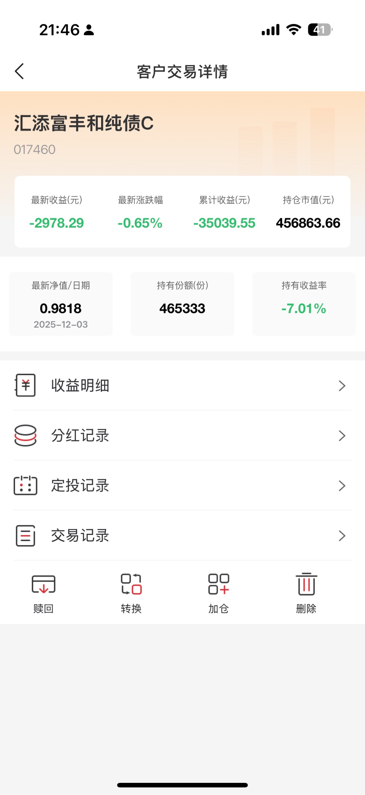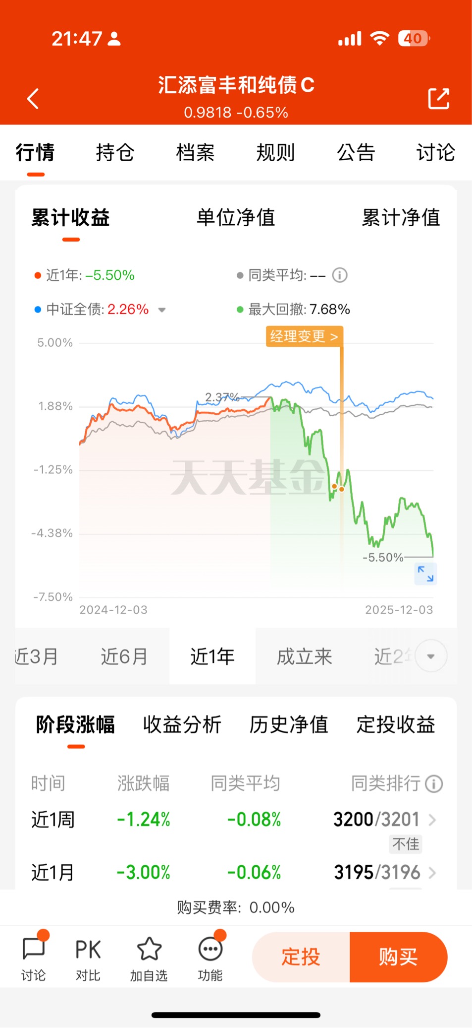 换新的基金经理之后就没好过 汇添富你这个公司拜托看看吧 说什么纯债 这么垃圾 $汇添富丰和纯债C[017460]$