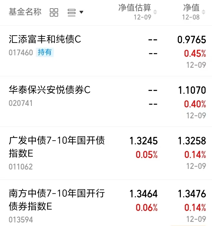 今天债券市场开启反弹,各年期国债期货拉升较多,长端表现比较强,利率债大面积晴天;近期债市调整比较明显,博取短期反弹还得是高弹性的债基更有性价比一点。像$汇添富丰和纯债C(OTCFUND|017460)$今天收了45个蛋,这是聚焦30年超长债,锐度高弹性大,堪称华子增强版,也是互联网平台就能入手的30年国债!看看其他相关基金收蛋情况: