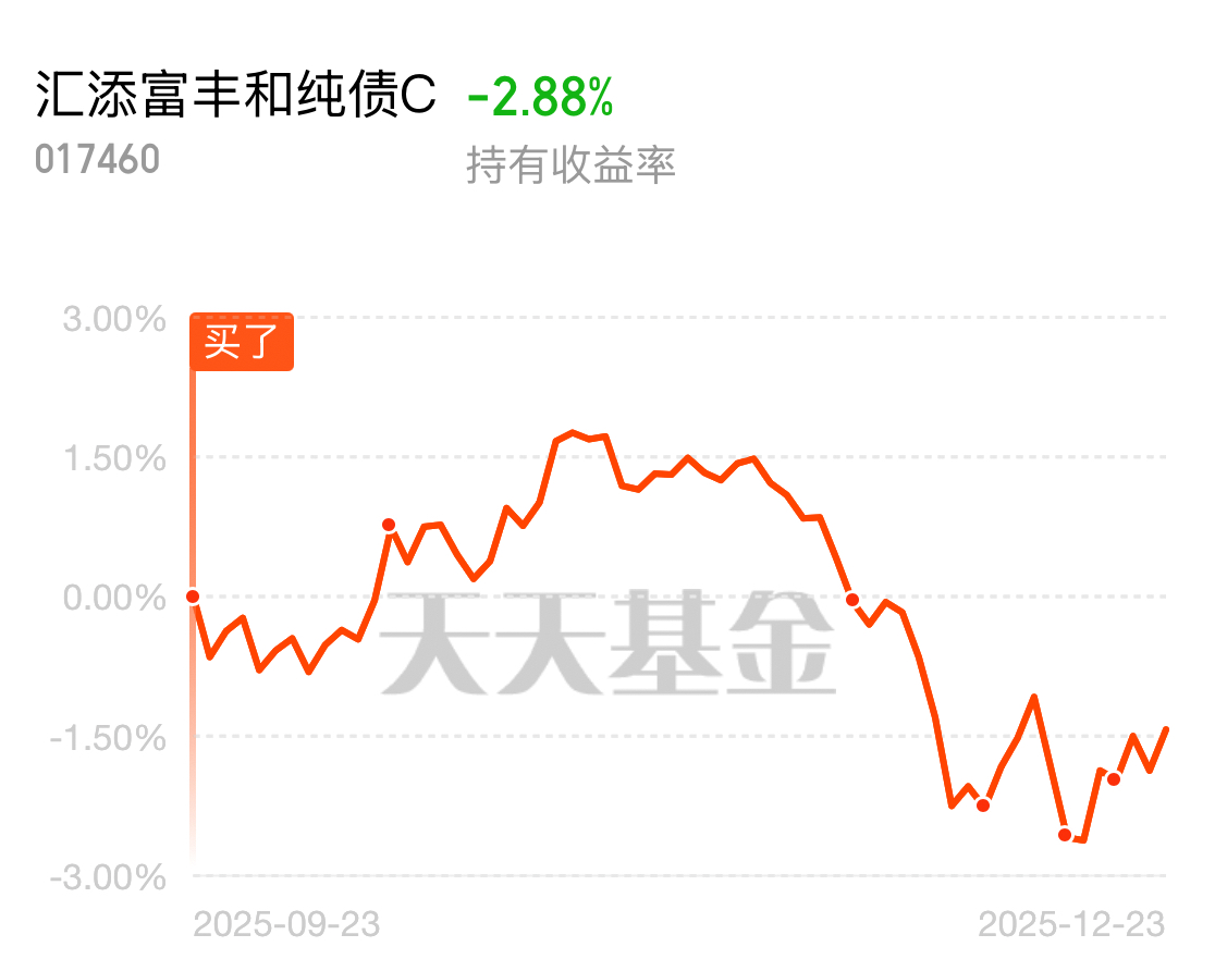 今天利率债还是很不错滴!特别是30年国债基金汇添富丰和纯债债券C今天爆蛋45个,比昨天碎蛋多一些。随着多次低位捡筹码,目前个人持有收益率已经控制在-3%以内了,等一波大的修复行情!