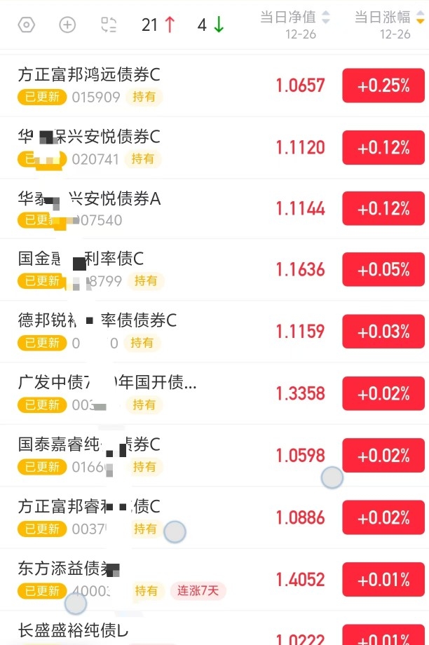 今天债市走得挺舒服,利率债全线上扬,信用债也开始回暖。鸿远又收了25个蛋,表现稳定,其他债基虽少但也红了。隔夜资金充裕,成本还降了点。感觉市场在为跨年铺路,这种温和上涨的节奏,正适合我们小散稳稳拿收益。