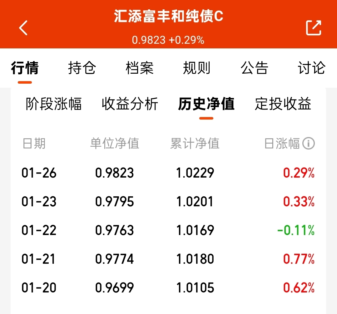 债市走稳,看好汇添富丰和纯债C接下来的上涨,近5个交易日有4天上涨,周一收蛋29