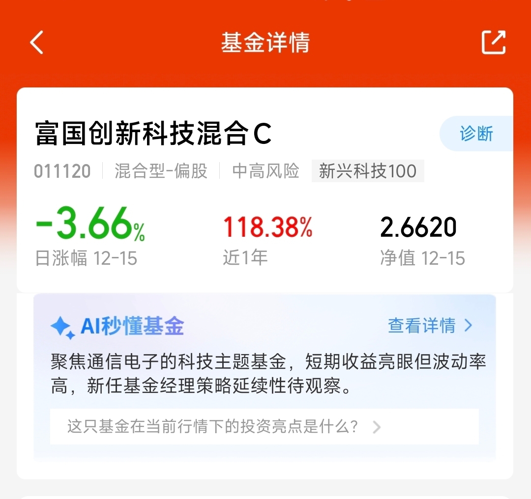 科技的行情还会回来的,相信波动只是一时的,这里回调了4.28%,富国创新科技也回调了3.66%,整体实力都不错,可以一起加点坐等反弹啊