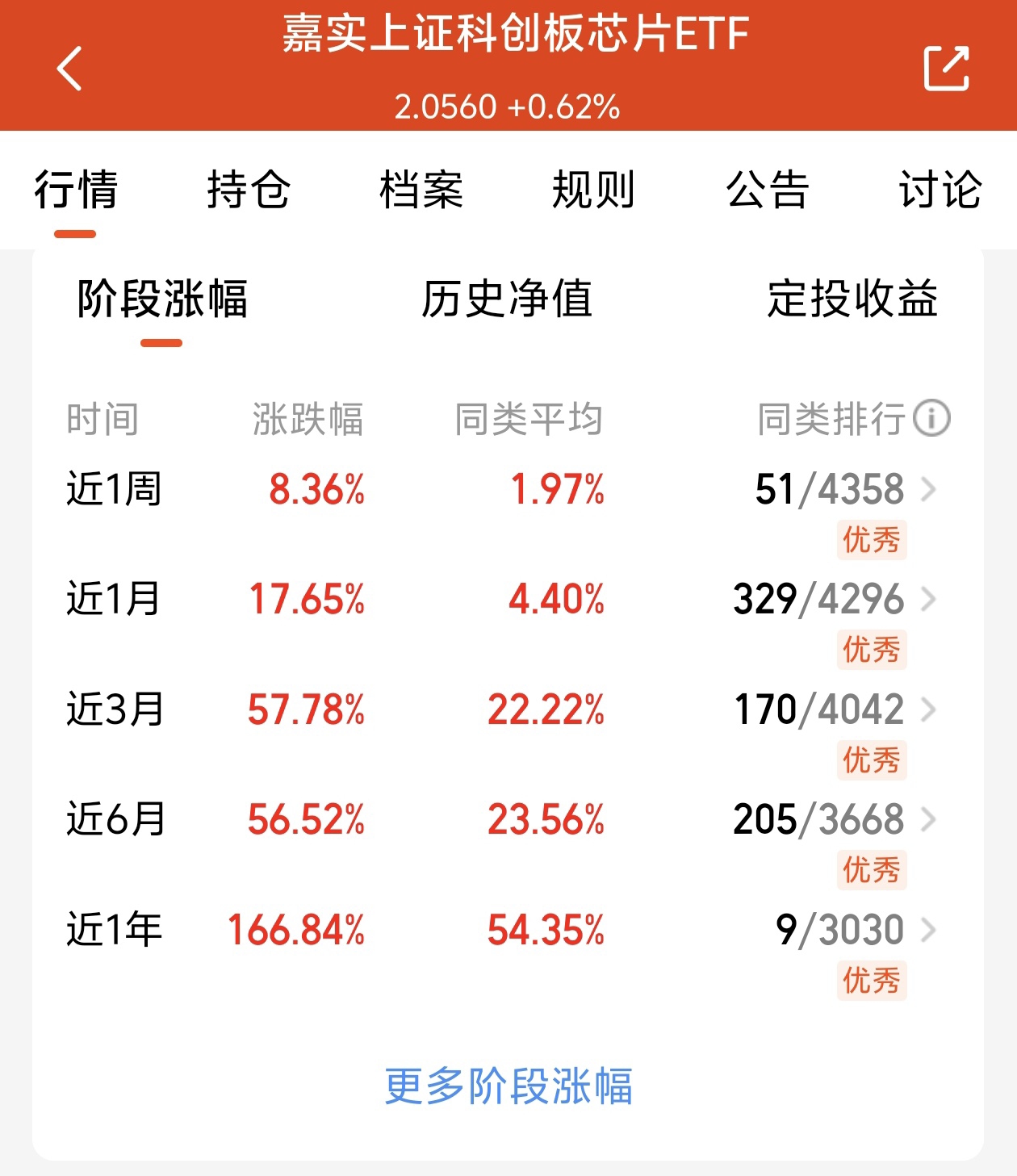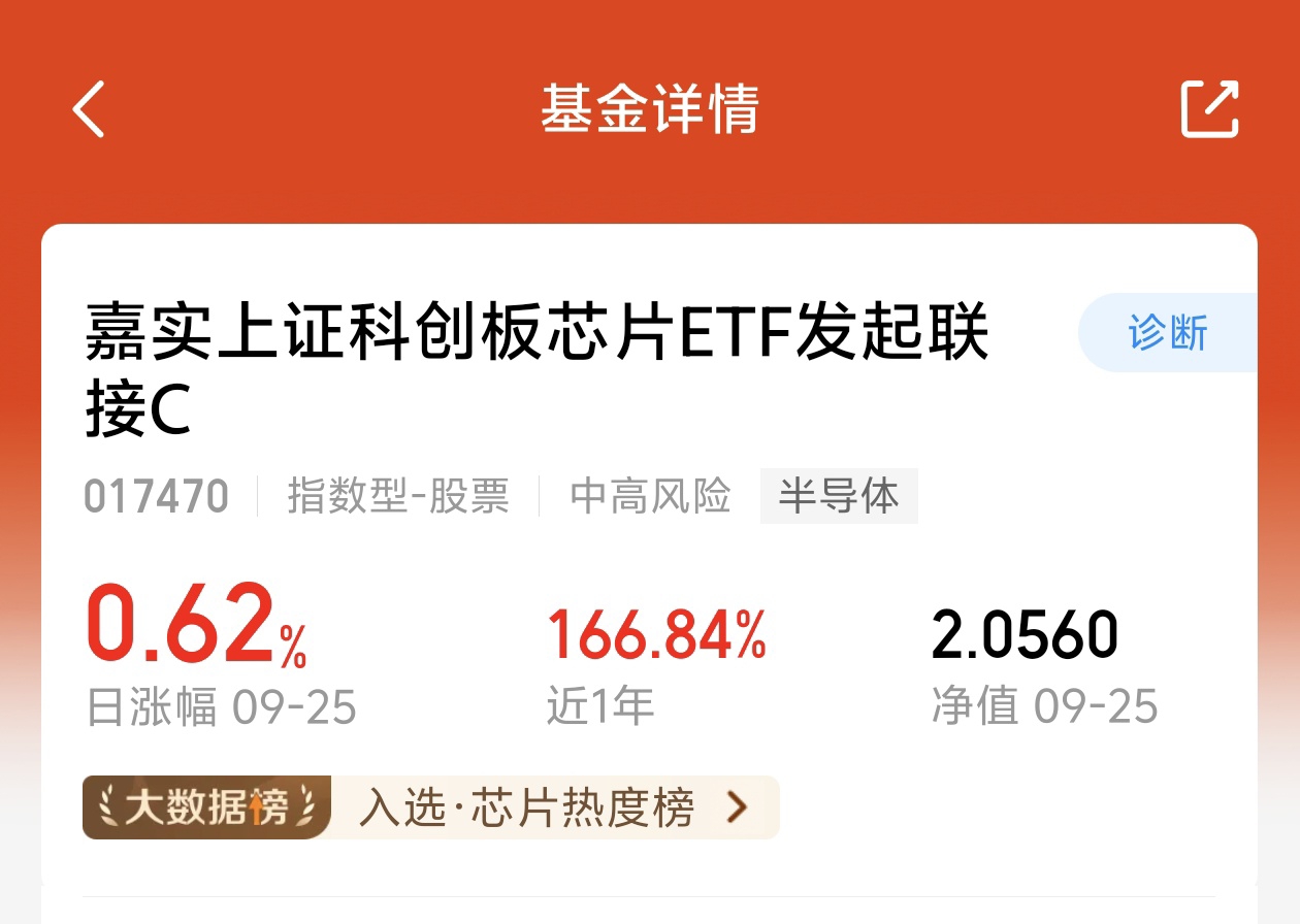 $嘉实上证科创板芯片ETF发起联接C$ 基金表现的也是非常的出色,昨天单日上涨了0.62%,近一个月上涨了17.65%,近一年的收益率高达166.84%,盈利能力强。各阶段业绩在同类基金排名领先,收益率远超同类平均。基金精准的跟踪科创芯片指数,上涨弹性大,爆发力强。半导体行业在政策与需求的双重推动下,将迎来新一轮的上涨。半导体行业具有较强的周期性,随着AI的快速发展,对芯片的需求呈现爆发式的增长。在外部环境的影响下,半导体国产替代进程加速推进。未来增长潜力巨大,期待后期收益,坐等吃肉!