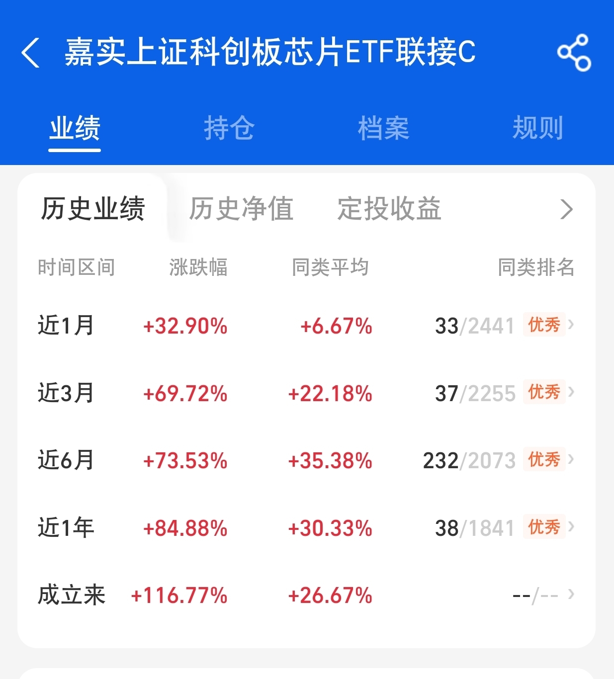 昨天大涨今天大跌,不过其实我盼这天好久了,正好可以大举低吸一笔了。最近芯片走的强势,今天回调幅度也不小。这支$嘉实上证科创板芯片ETF联接C$ 紧密跟踪上证科创板芯片指数,聚焦28家涵盖设计、设备、材料等环节的芯片产业龙头,一键布局国产芯片核心资产的高效工具。近一个月涨了32.90%,近6个月涨了73.53%,近一年涨了84.88%,业绩优秀,远超同类基金,目前我们Z策支持与半导体周期复苏,接下来我还是很看好的。