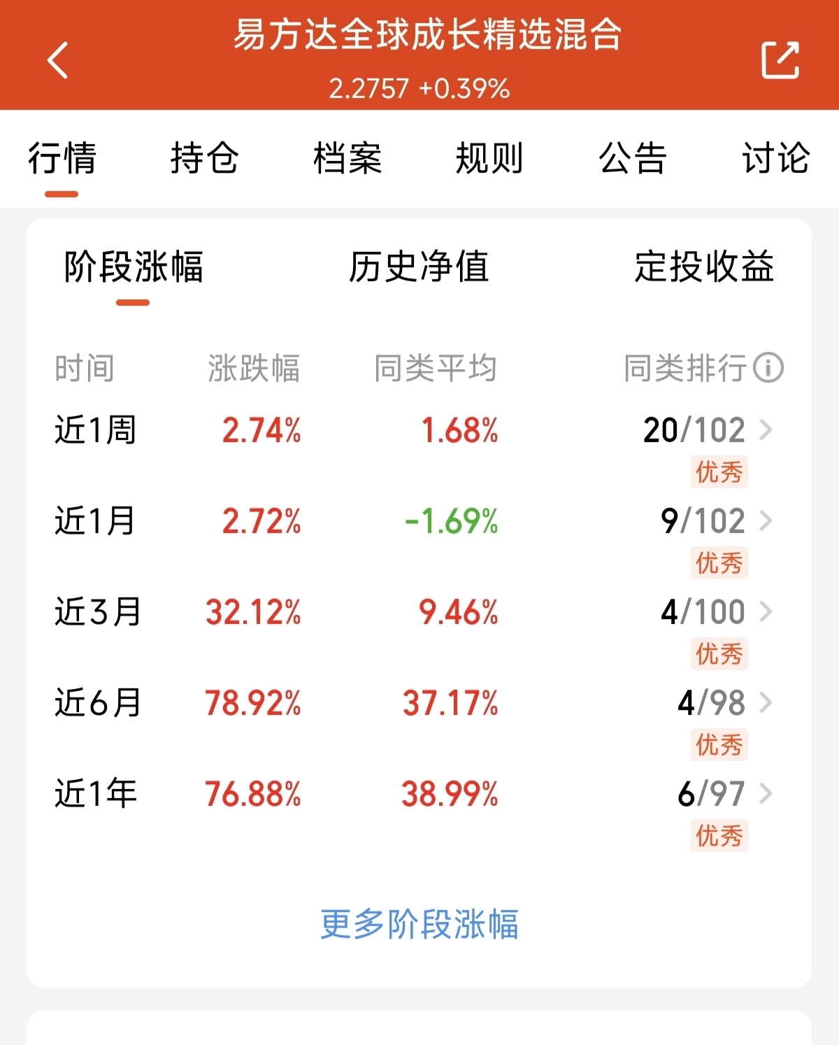 最近的全球市场不太稳定。但是长期来看,全球市场科技主线还是比较明确的。易方达全球精选混合就是聚焦全球科技的主动混合基金。长期来的表现是真的不错。经理通过投资a股,港股,美股多进来把握全球科技机会。不但能够把握全球不同市场的科技机会,还可以规避单一市场波动风险。近一周上涨2.74%。近一年上涨76.88%。长期跑赢同类平均业绩。而且抗波动的能力强。我看好未来的成长表现。