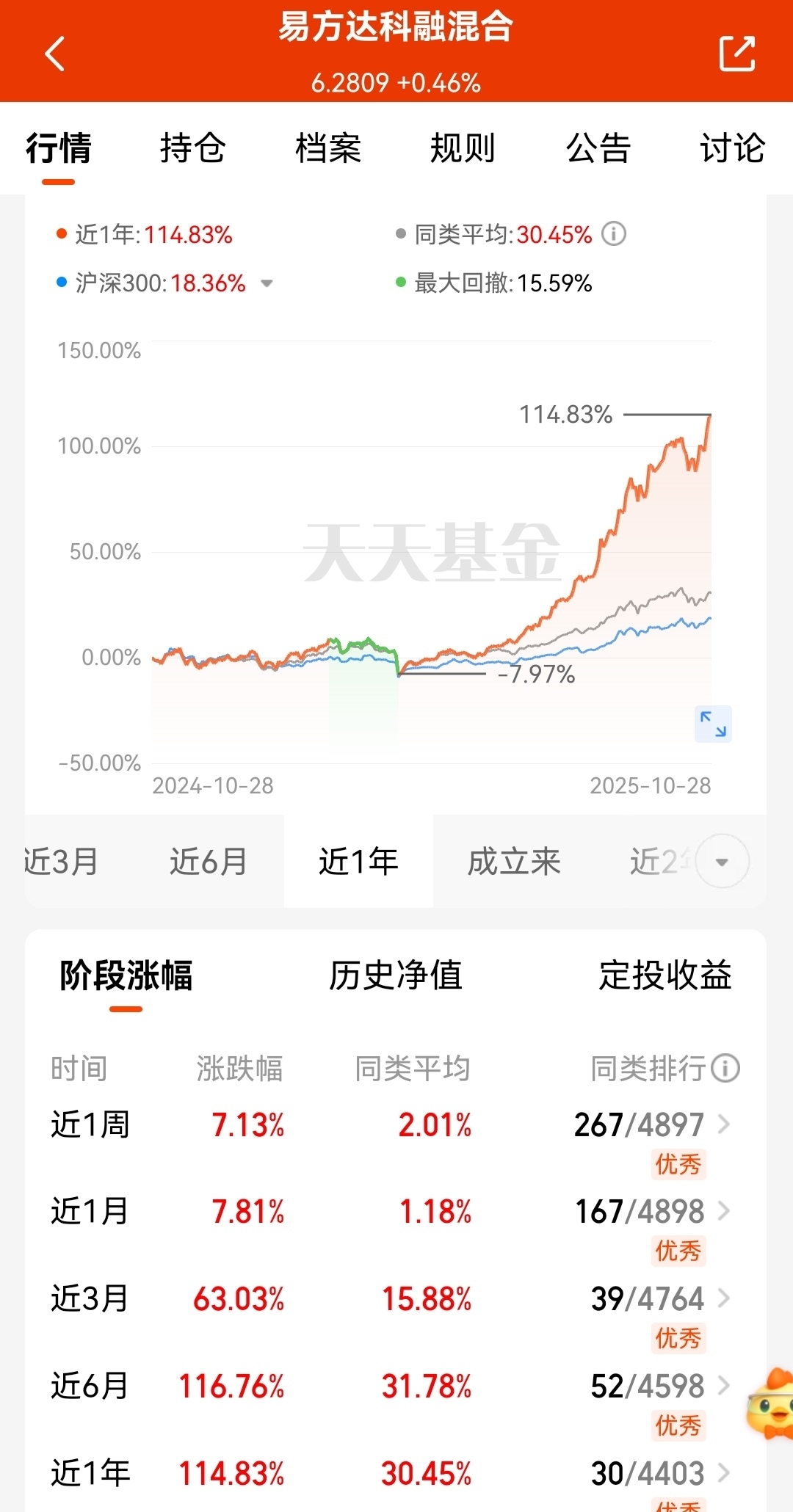今日大盘行情稳定上涨,上证指数再次站上4000点,但个股却分化明显,可见当前板块热点轮动极快,所以在布局时还是要均衡持仓,易方达科融混合这款产品不仅仅买了科技,还买了反内卷相关的新能源,事实证明,近期业绩远远领先同类,近6个月涨幅高达116.76%,可见基金经理前瞻能力之强,及时预判市场趋势,及时规避风险,我也准备顺应行情,开始定投起来!