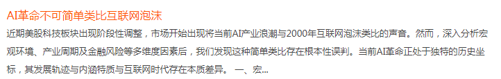 如今的大处投资论坛,讨论得最热门的话题,几乎都与AI相关,画风许我是这样子的,我随意截图如下。是的,AI革命,确实不可简单类比互联网泡沫,但这并不表示,目前与AI相关的板块,就值得投资(具有投资上的性价比)!