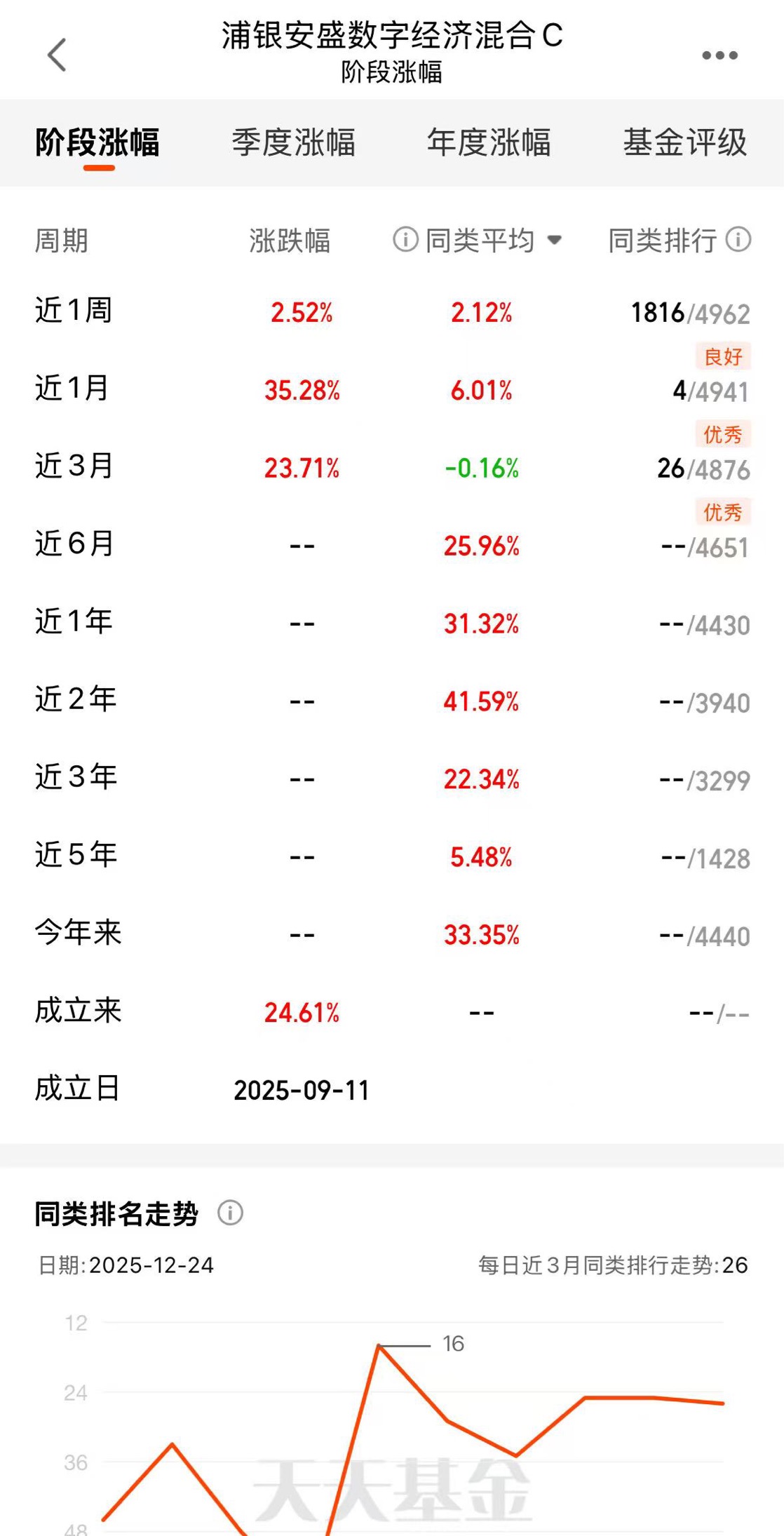 $浦银安盛数字经济混合C$ 近一个月,近三月TOP,新基金规模小压力小干的猛后起之秀不可小觑