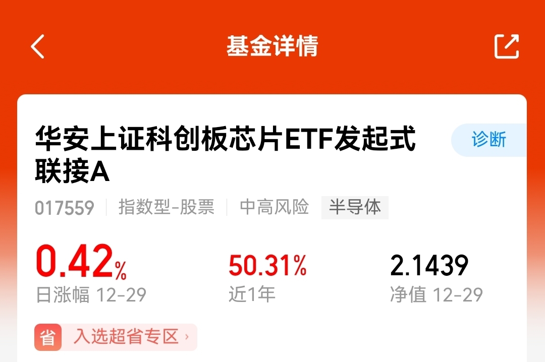 $华安上证科创板芯片ETF发起式联接A$ 涨势好!日涨0.42%,近1年涨50.31%,半导体含量高、弹性足,入选超省指数0折申购
