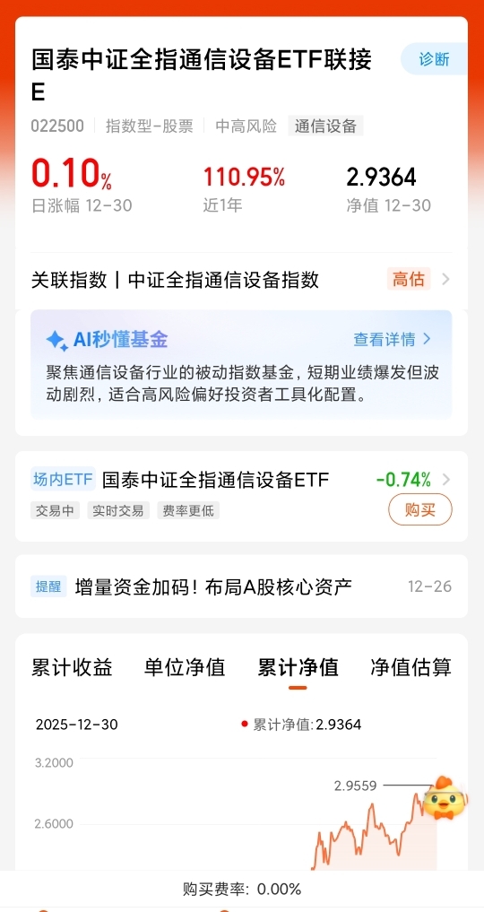 这阵子芯片板块涨得不错,我持有的嘉实科创板芯片ETF表现亮眼,但同帐户的国泰中证全指通信设备ETF联接E也不逊色,近1个月涨16%、近一年111%。科技巨头如Meta收购Manus发力AI,算力需求爆发。国泰通信设备ETF聚焦算力硬件,与芯片ETF形成上下游互补:芯片是算力核心,通信设备是载体,共同受益AI高景气。老船长经验丰富,值得长期持有。