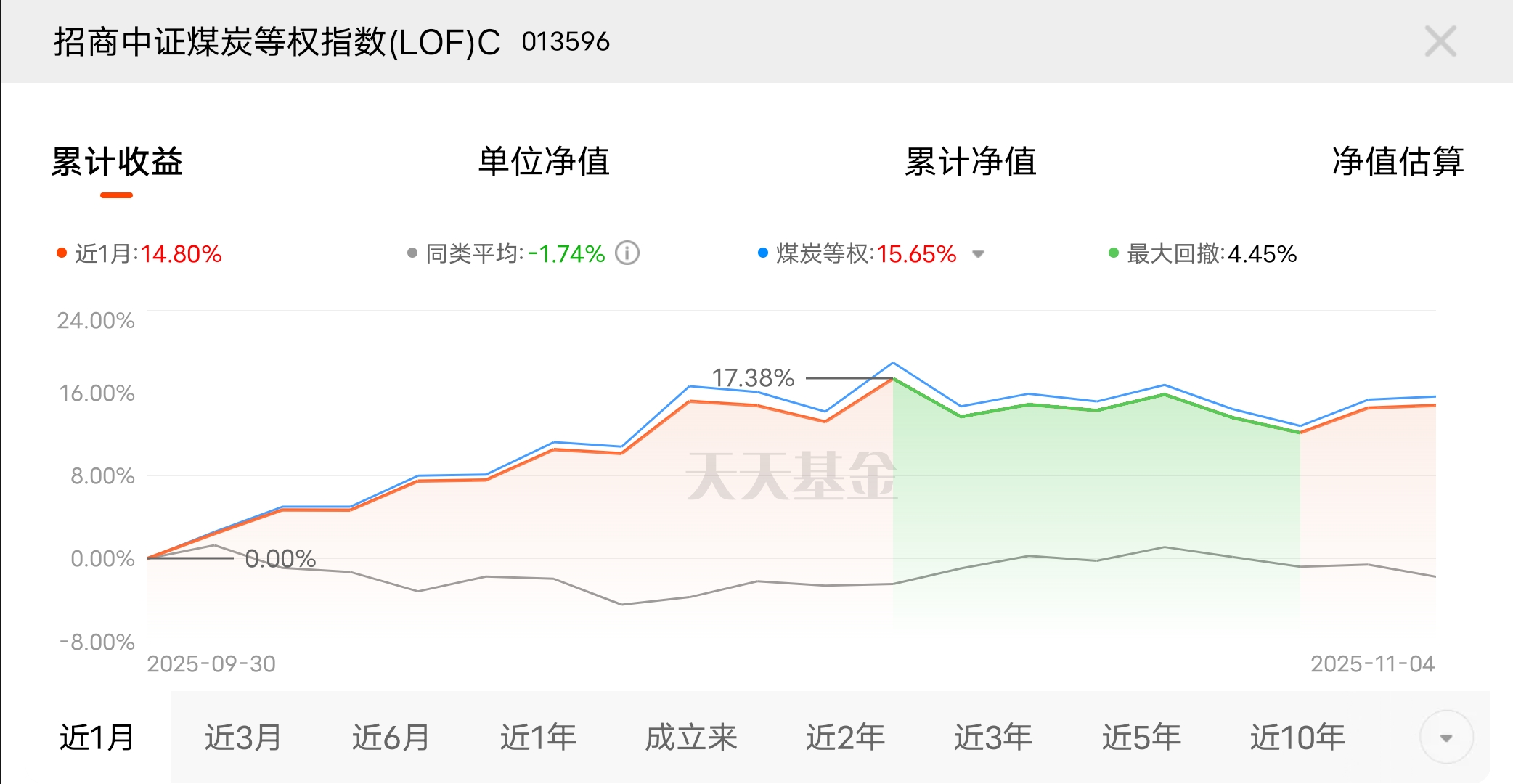 开盘半小时,煤炭板块的量价配合很好,涨得很实在,让人放心。选基金就得选这样的,招商中证煤炭等权指数C近1个月14.98%,让人满意。