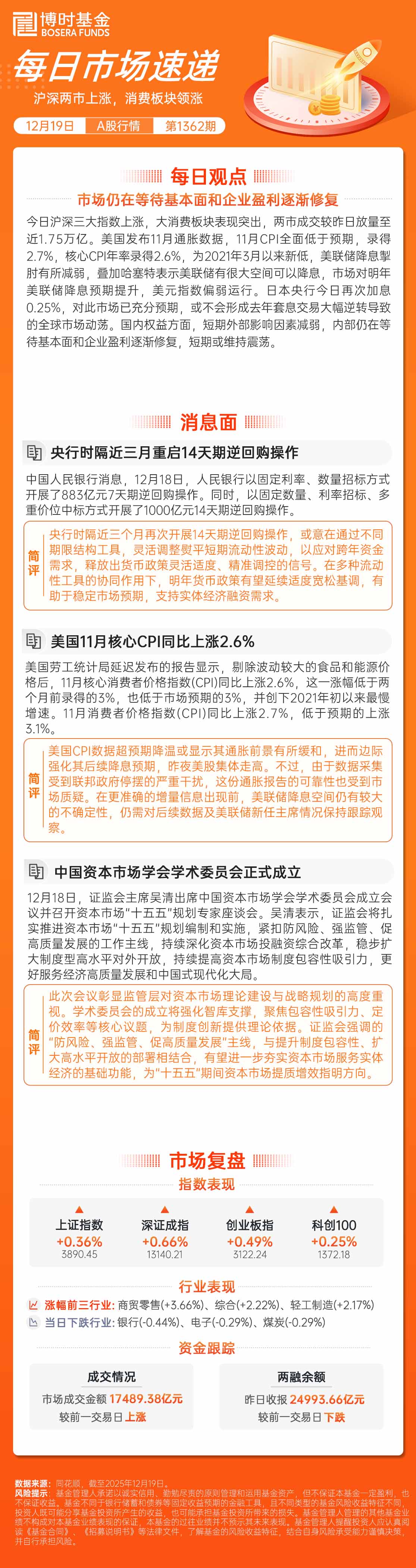 【博时市场点评12月19日】沪深两市上涨,消费板块领涨