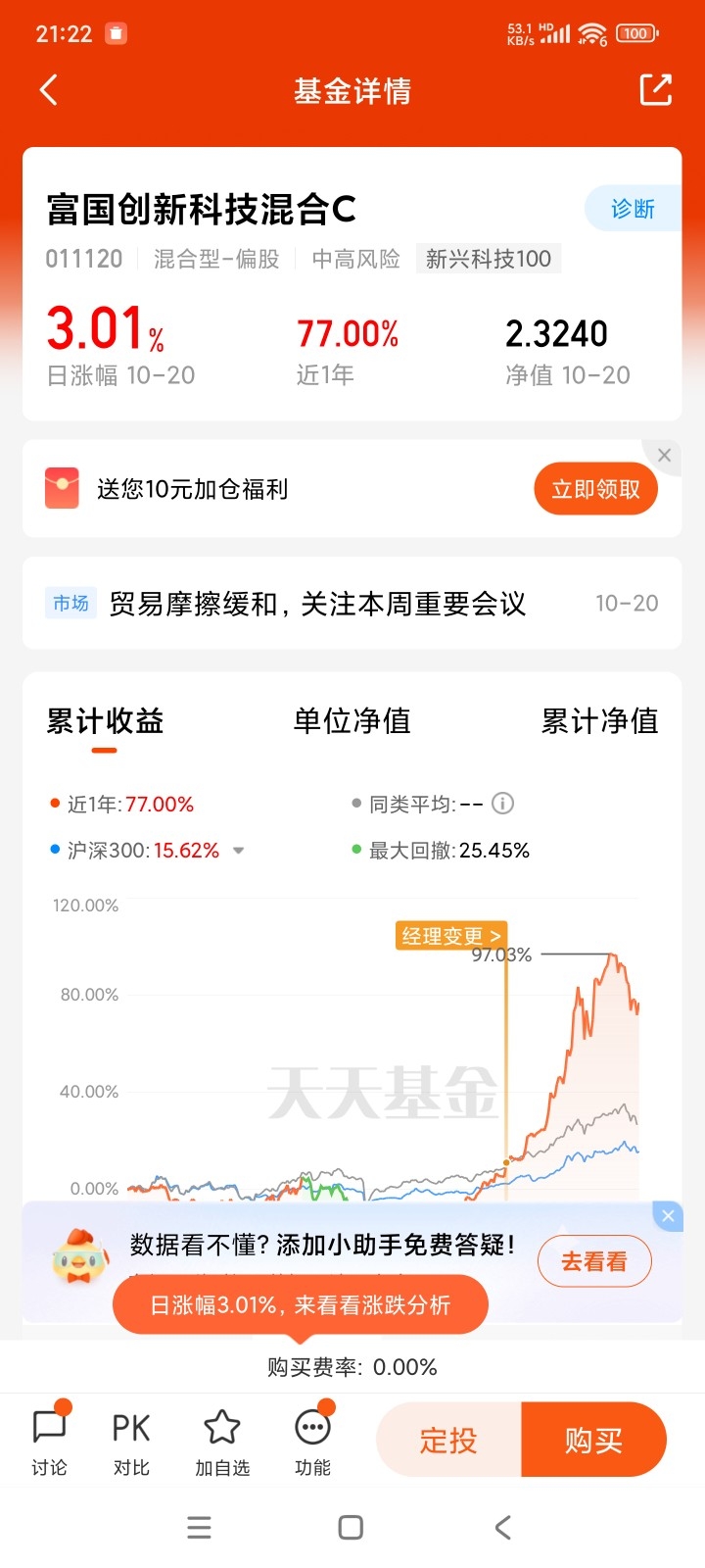 $富国创新科技混合C$ 今晚净值超3%,专注人工智能赛道,重仓CPO,现在科技行情领涨,直接安排上车起来了