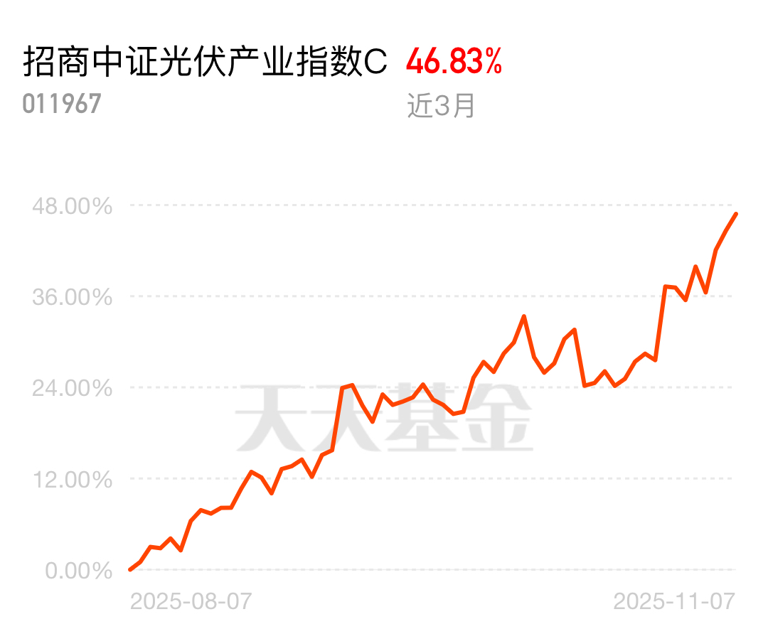 光伏行业的政策利好不断释放,从国家到地方都在支持,发展环境特别好。招商中证光伏产业指数C近3个月涨了46.83%,在利好政策的推动下,业绩一路上涨。$招商中证光伏产业指数C$