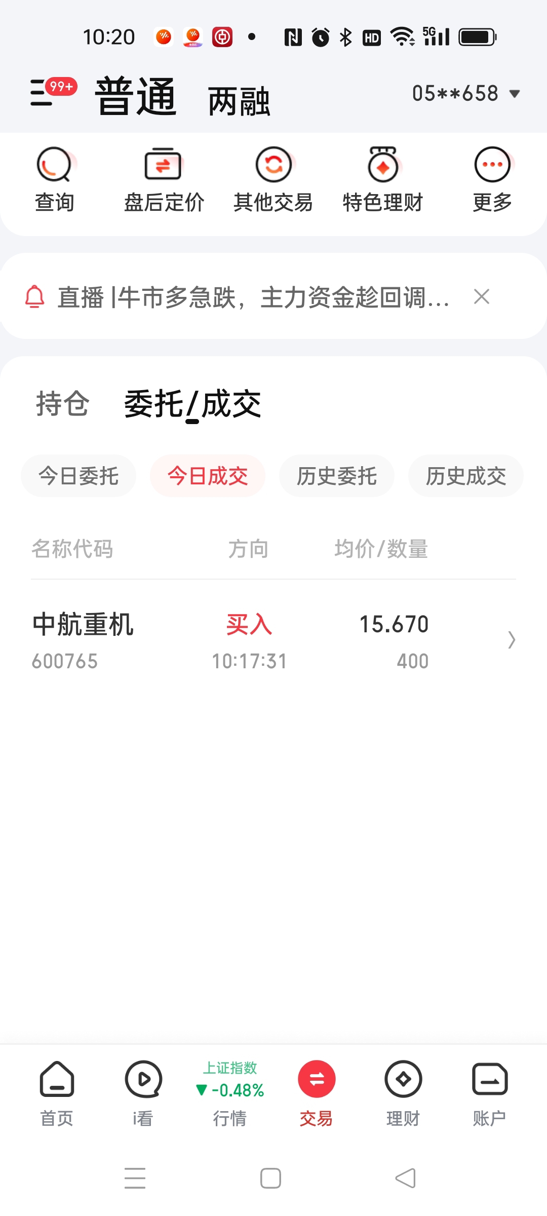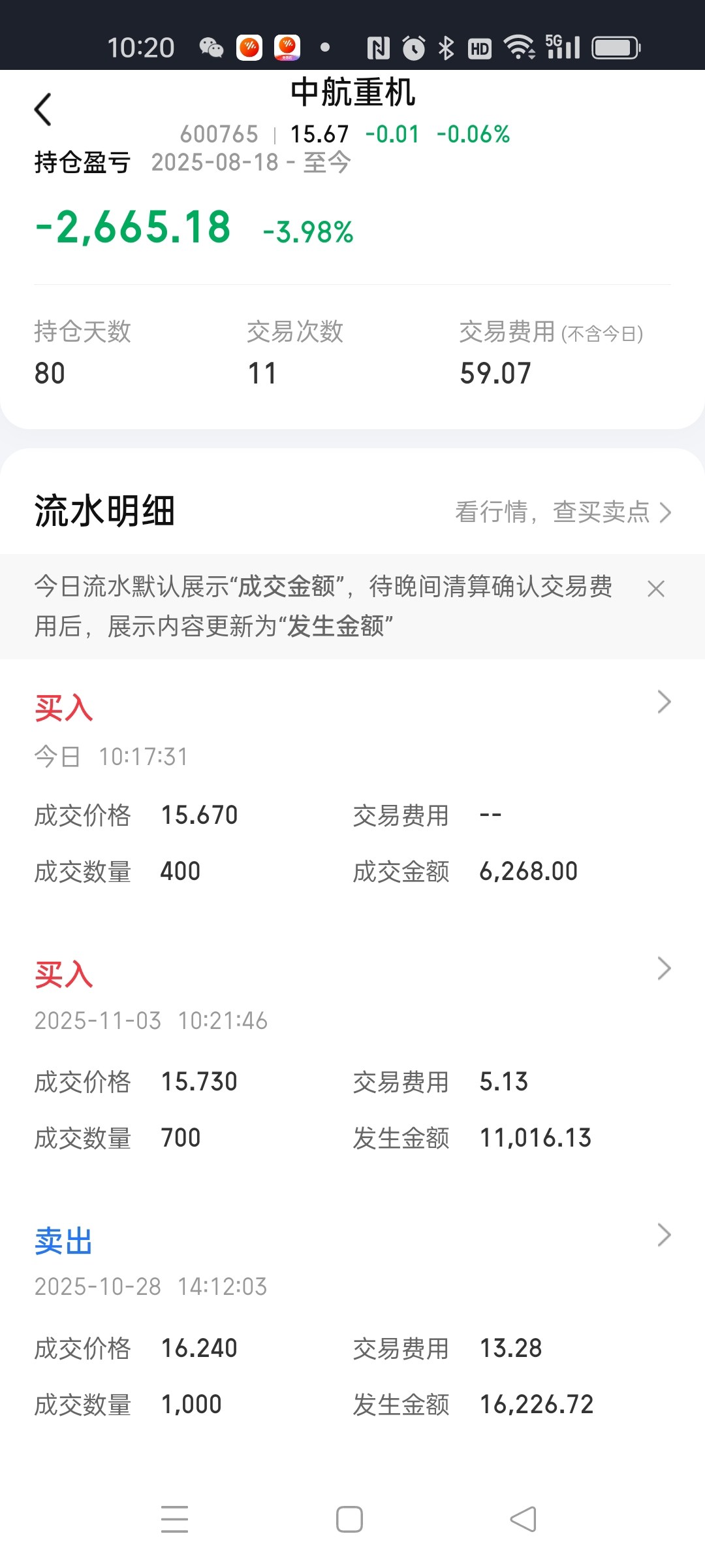 上午我在15.67元买了400股代码:600765中航重机,前天15.73元买回来700股,上周16.24元抛出1000股,等于做了一次差价5毛多的高抛低吸,也降了持仓成本,目前还暂亏2600元左右,还套4个点,主力只要再轻轻拉升一下,我就可以解套和赢利了,这就是短线来回的做股票的方法。