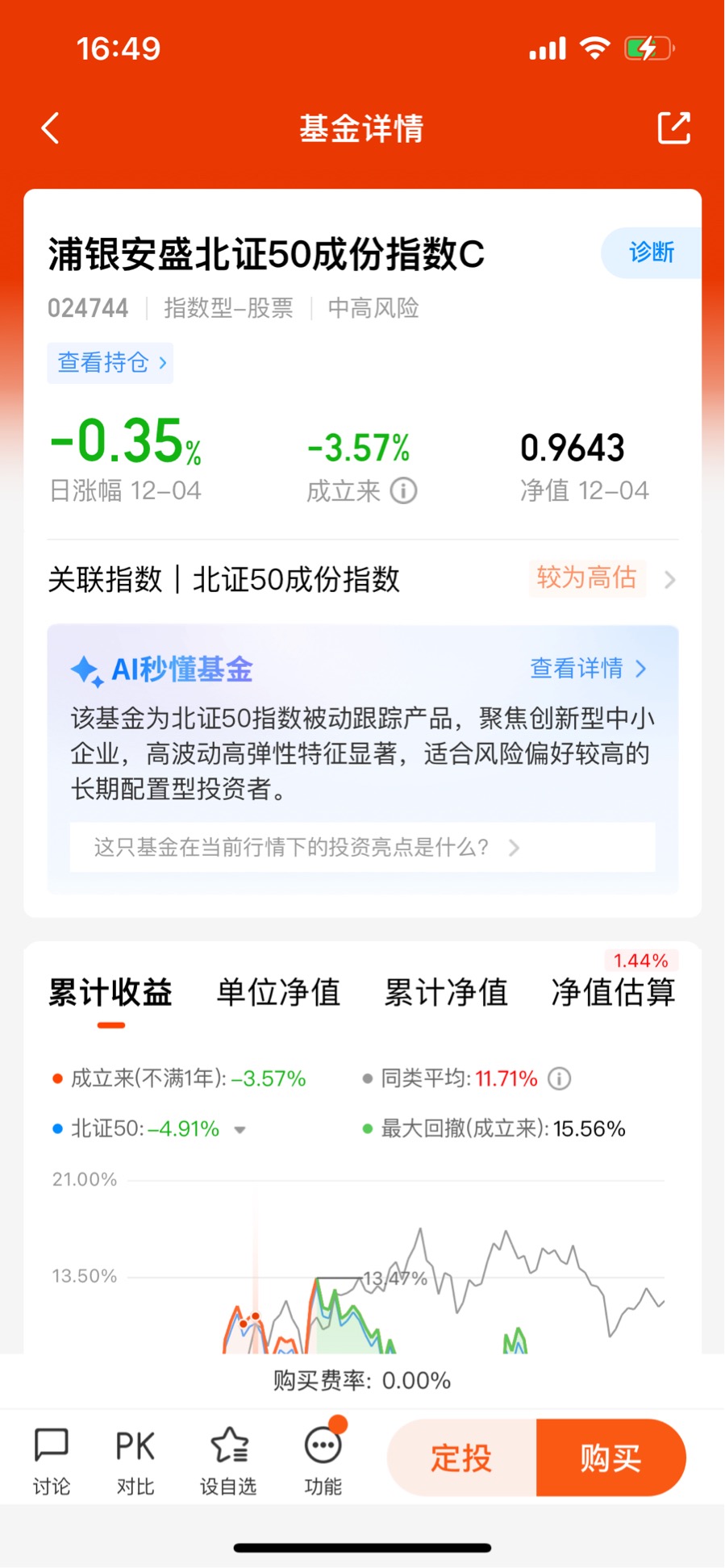 浦银安盛北证50费率低不限额,7天免赎回费,北证50有30cm高弹性,专精特新企