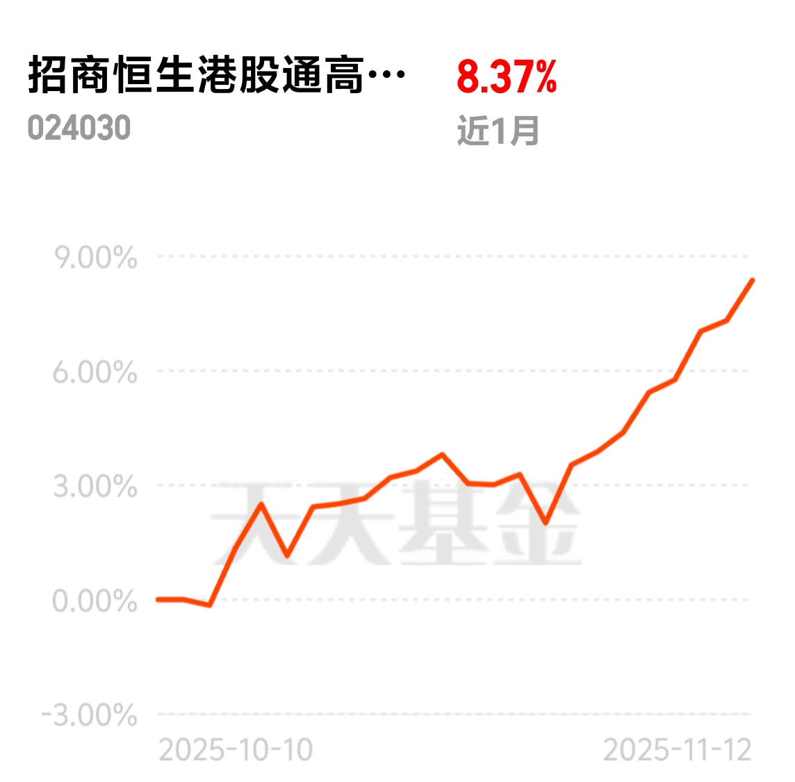聪明钱持续加仓高股息资产,港股红利低波赛道的投资价值被不断挖掘。招商恒生港股通高股息低波动ETF联接C近1个月涨了8.37%,跟踪的指数金融地产占比超60%,6%高股息+低波动,还有低费率和定期分红,底仓配置选它不踩坑。