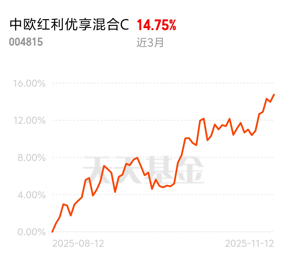 市场不确定性大,资金都往安全的地方去,低估值红利资产成了避风港。中欧红利优享灵活配置混合C近3个月涨了14.75%,红利+有色双主线发力,蓝小康经理规避风险,满2万减36加仓,配置它放心。