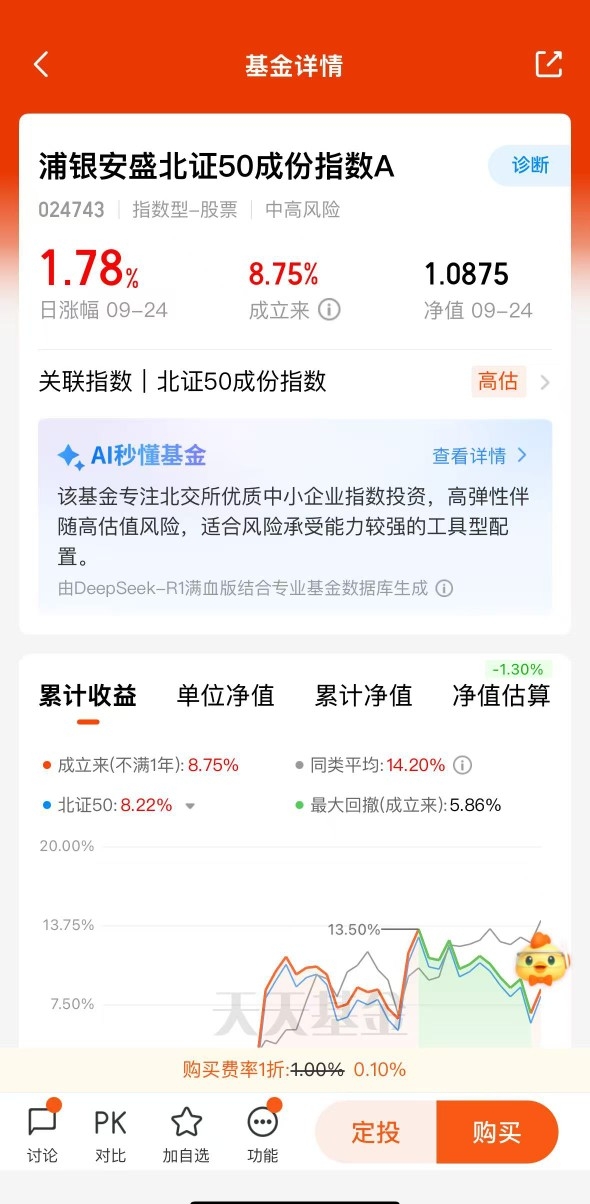 牛市看仓位,不限额的北证50给大家找到了,浦银安盛北证50跟踪紧密,收益稳定$浦银安盛北证50成份指数A$