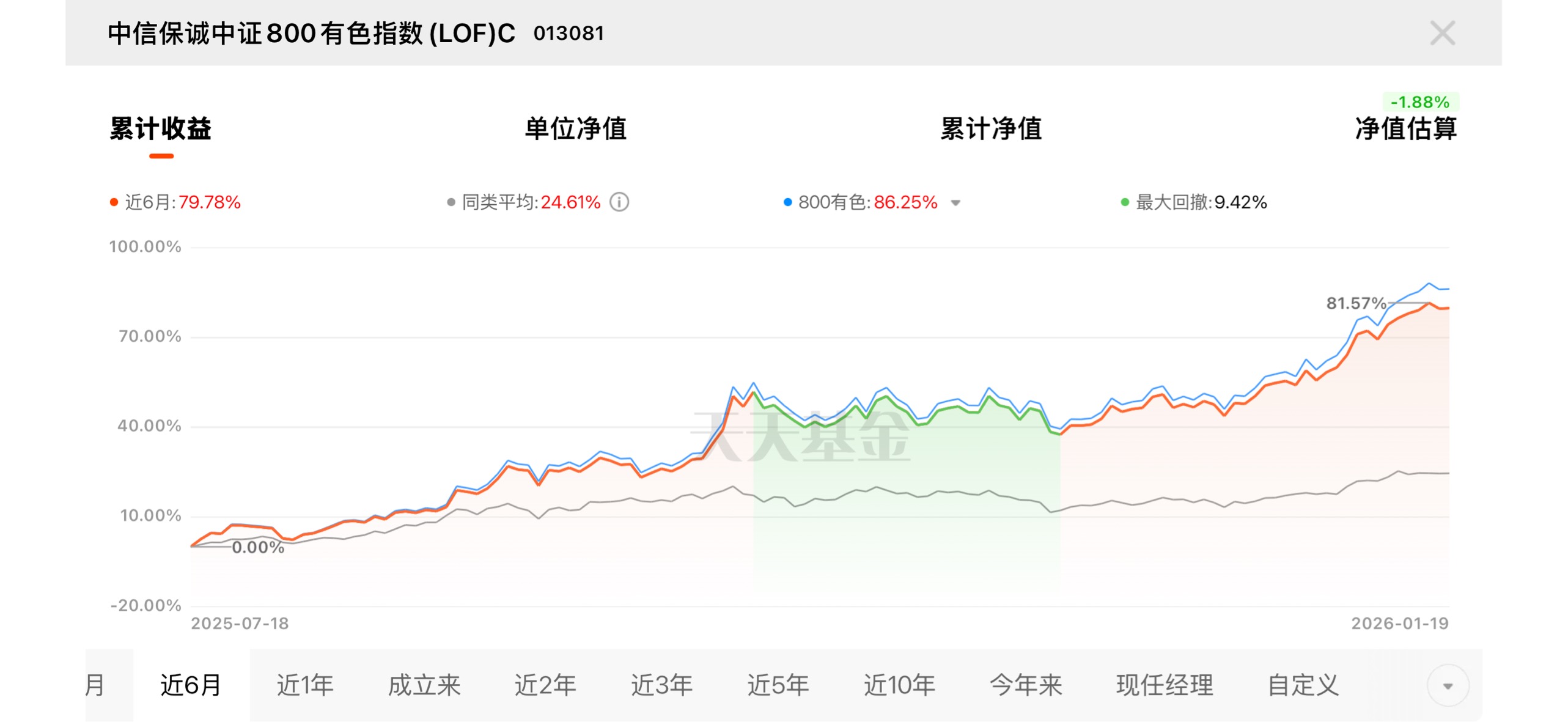 国内宏观政策利好不及预期,市场情绪低迷引发有色板块回调。不过$中信保诚中证800有色指数(LOF)C$ 近6月79.78%的涨幅有支撑,后续政策将持续加码。回调窗口抓紧加仓,提前布局政策红利标的。