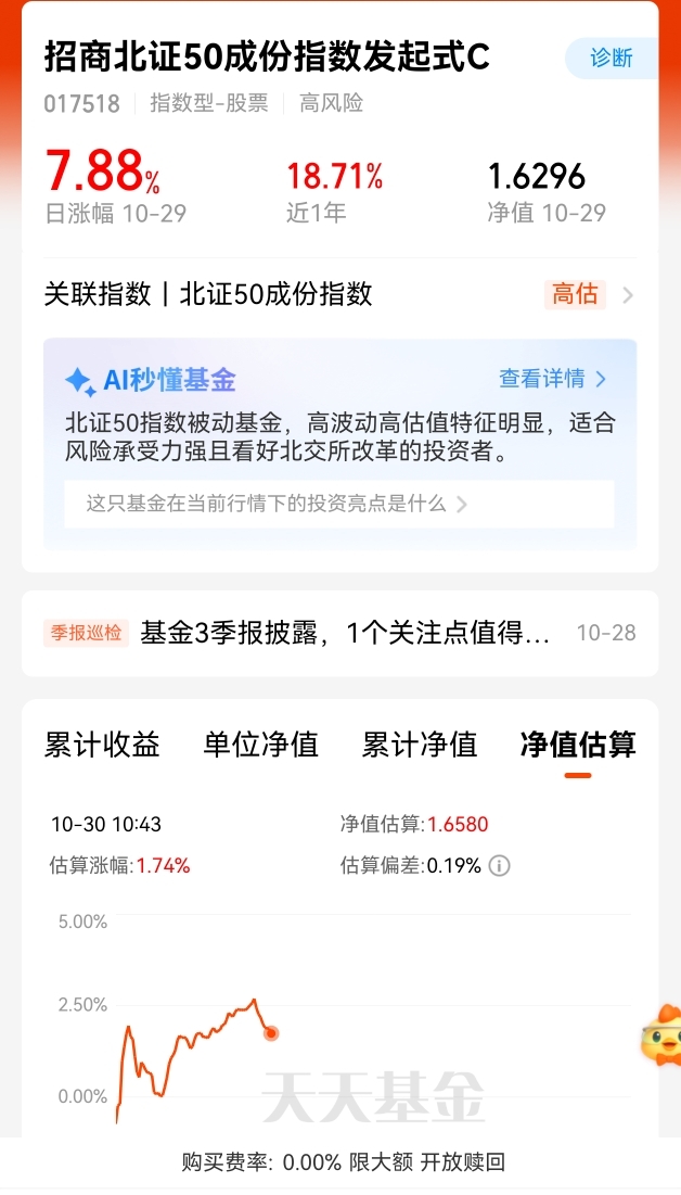 今天a股市场三大股指集体低开后震荡整理,多个主流板块承压,不过我发现北证50指数逆势上涨。$招商北证50成份指数发起式C$ 昨晚涨幅7.88%,太猛了!当前北证50估值仍处于历史较低分位,政策面利好持续释放,流动性改善预期增强,中小盘科技成长风格凸显,后续上涨空间很大,我觉得逢低布局一些还是可以的。