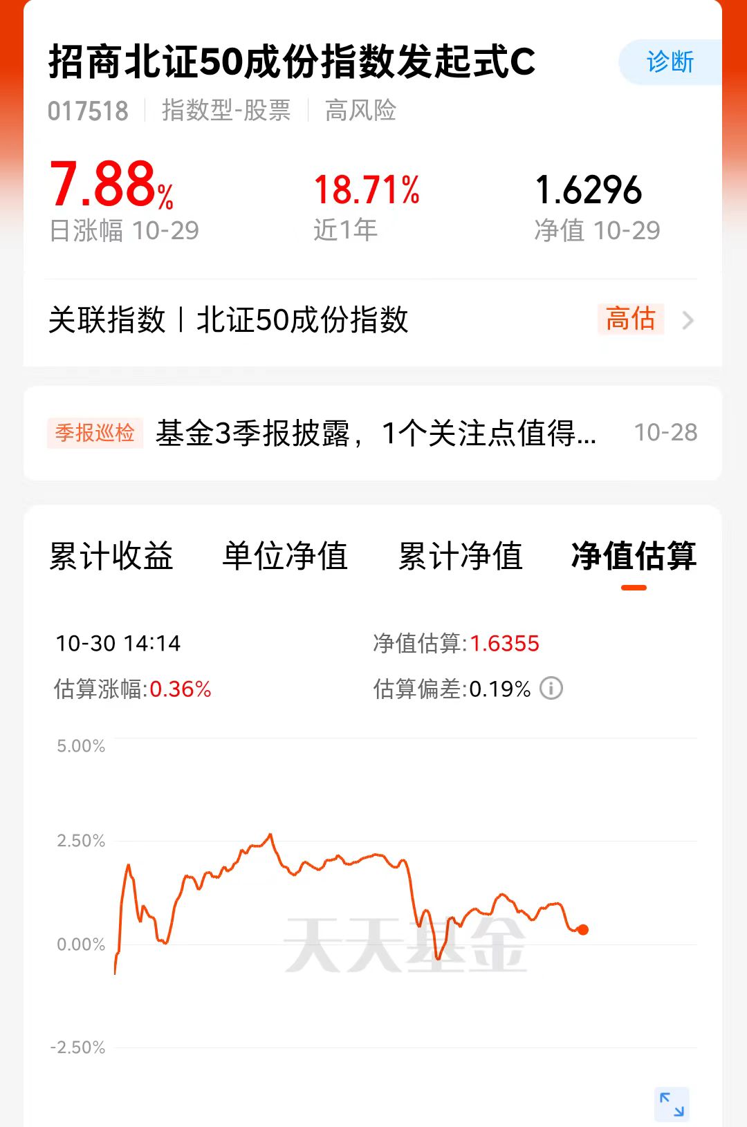 昨天股市行情上涨,今天震荡,北证50逆势上涨,看来资金切换到北证50了。北交所流动性强,北证50弹性大,得到了大家的偏爱。$招商北证50成份指数发起式C(OTCFUND|017518)$昨天大涨7.88%,反弹能力强,可以关注一下呢。
