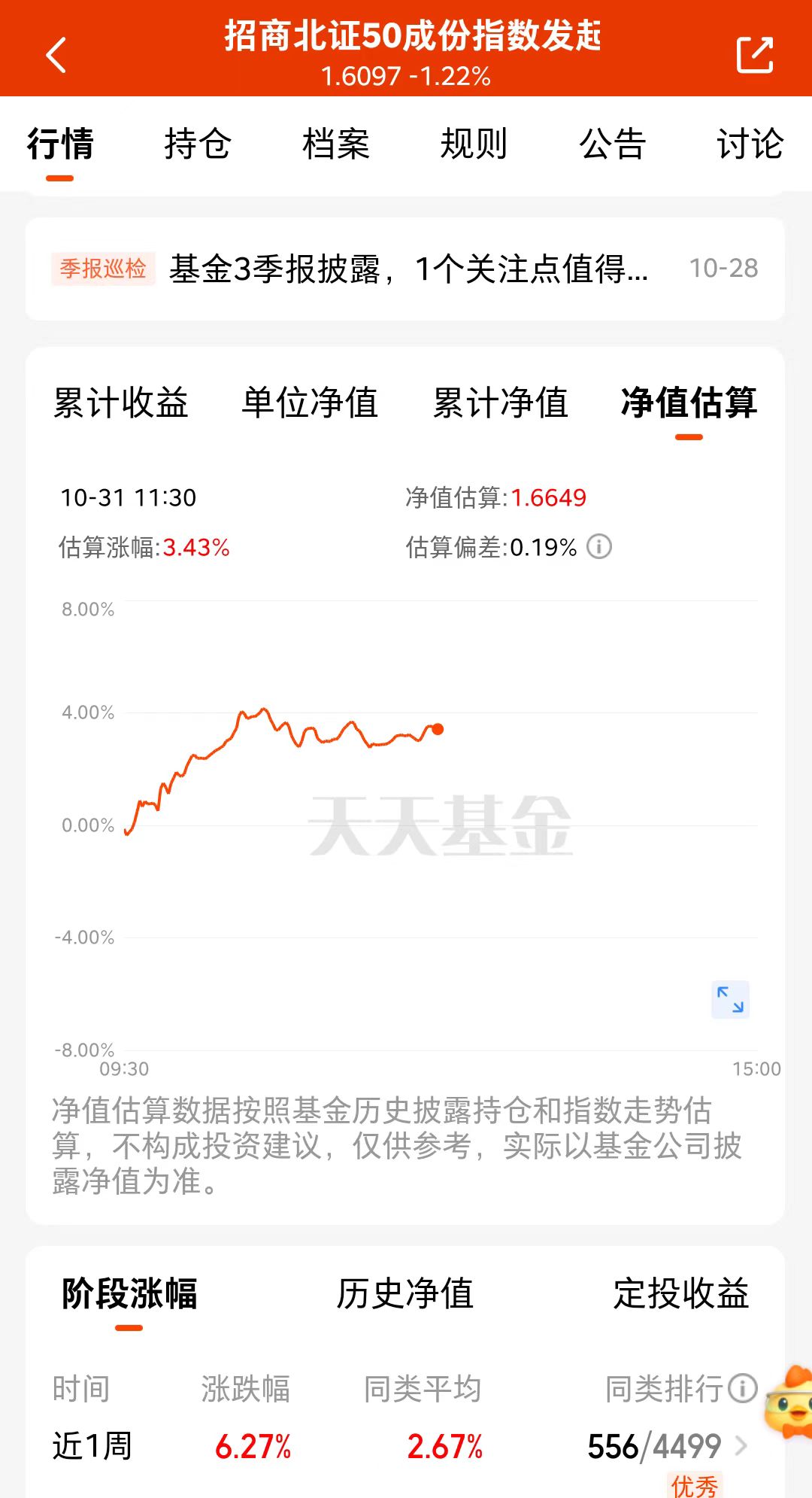 今天股市行情继续震荡,北证50继续反攻上涨,主力净流入增加,$招商北证50成份指数发起式C(OTCFUND|017518)$,盘中估值涨超3个点,近一周上涨6.27%,涨幅拉升给力,北交所经过几轮的调整,叠加十五五强调新质生产力仍是主线,超跌反弹后的北证50是良好的投资窗口