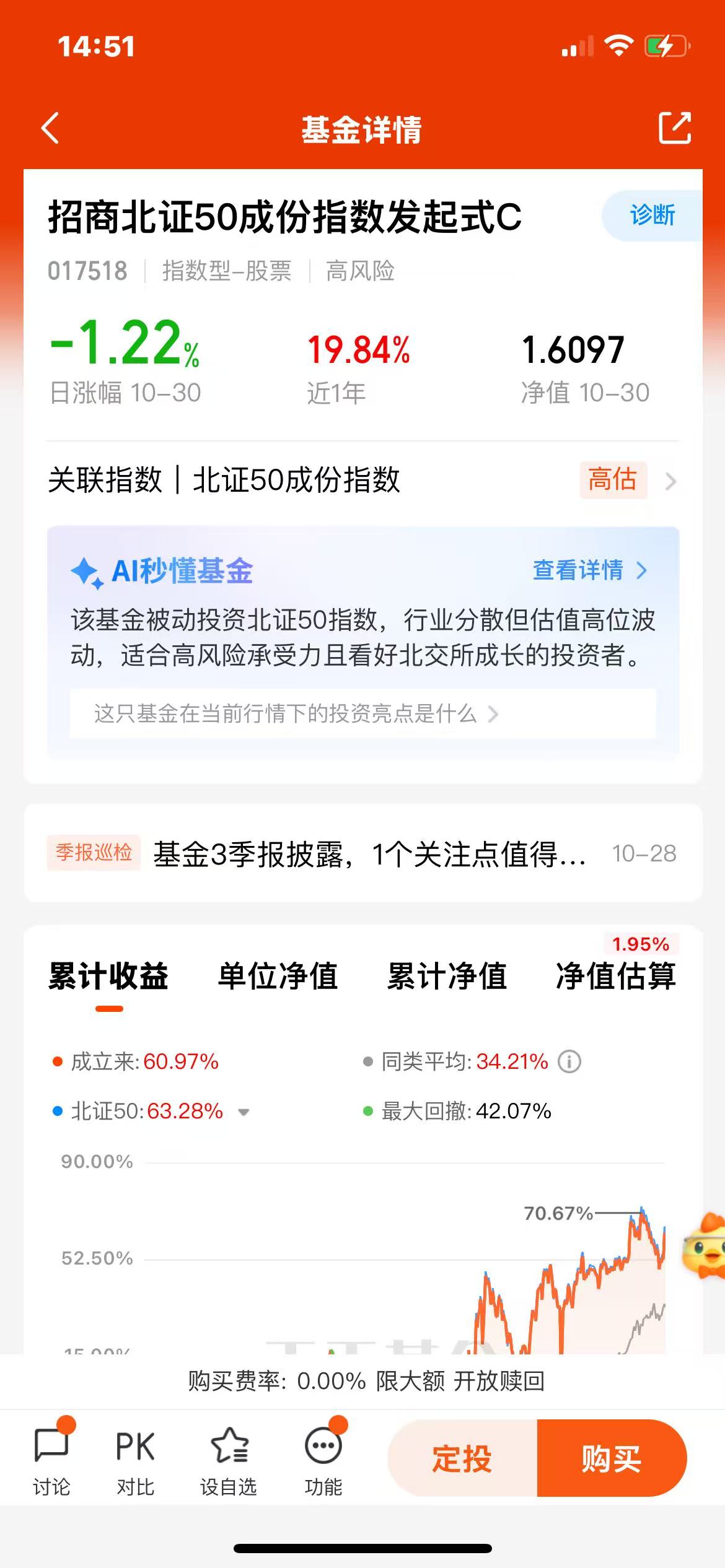和大家一样,我也速度上车了,前面科技涨太猛了,现在要回调,其它指数,像创业板也是位置太高了;而北证50经历前段时间的回调,要走向上的趋势,总之 ,现在上车还不晚,先冲一波!$招商北证50成份指数发起式C(OTCFUND|017518)$