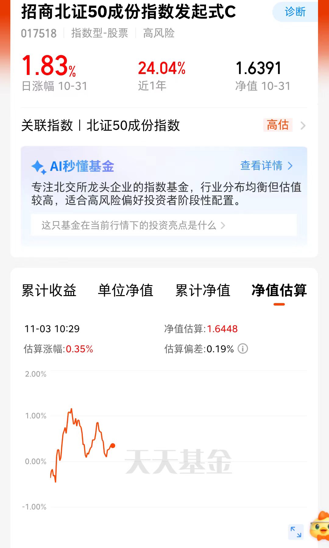 今天大盘指数低开低走,继续调整,但是在金融街论坛上,北交所董事长明确提到,要“加快推出北证50ETF”+“盘后固定价格交易”。这两个关键词,一个代表资金入口,一个代表流动性机制。意味着:北交所的流动性问题,可能真要被解决了。利好这不就来了嘛。$招商北证50成份指数发起式C(OTCFUND|017518)$,上周五逆势上涨1.83%,今天盘中估值继续拉升,近一周上涨7.08%,业绩优秀。