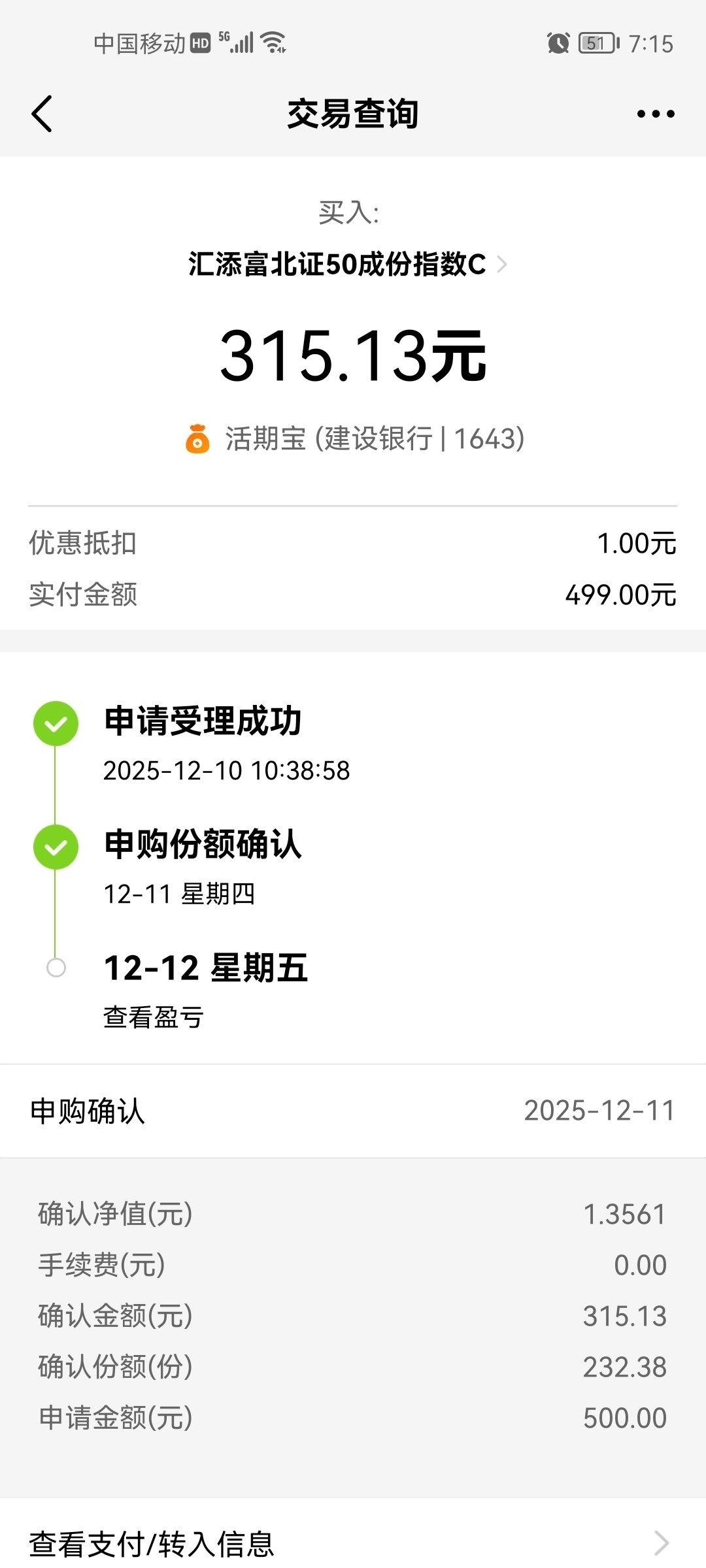 昨天买500块钱,只成交了315,这基金是不是看到今天大涨,退了部分钱回来!