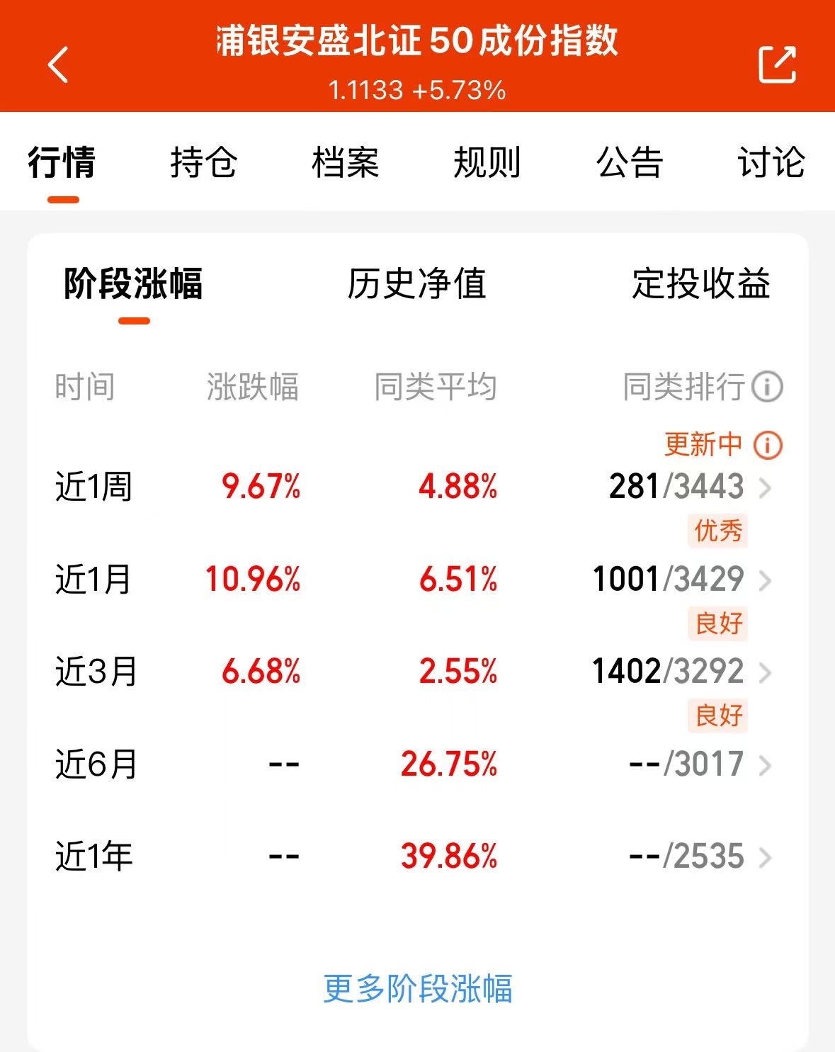 想冲北证50可以看看浦银这个产品,今天大涨5.73%,额度充足,做波段操作方便,已经6连涨了,值得上车$浦银安盛北证50成份指数C$