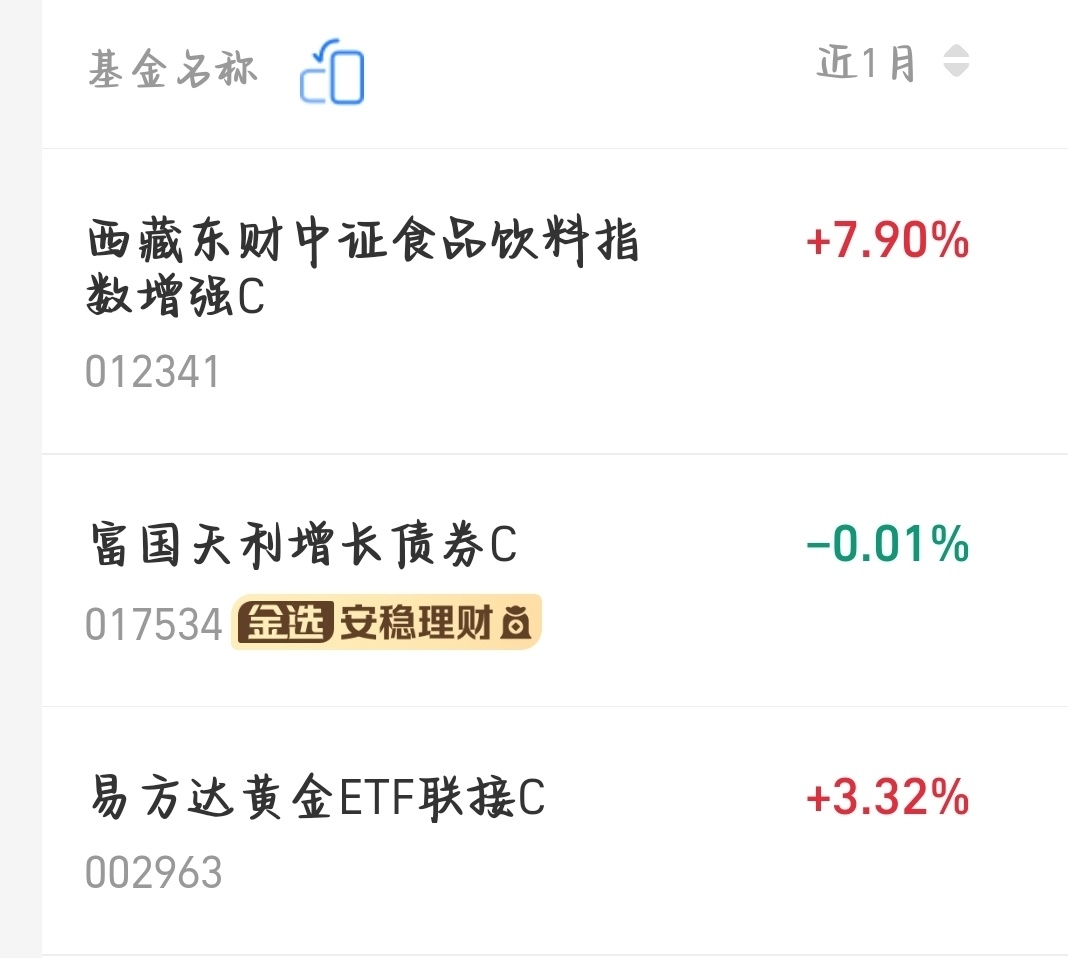 家人们,我研究好久啦!现在牛市行情,按照规律,马上就要轮到食品饮料发力。我看了$西藏东财中证食品饮料指数增强C$ 持仓都是好公司,已经三年没涨,最近一个月上涨7.9%,我觉得这次补涨潜力巨大,我先梭哈了!