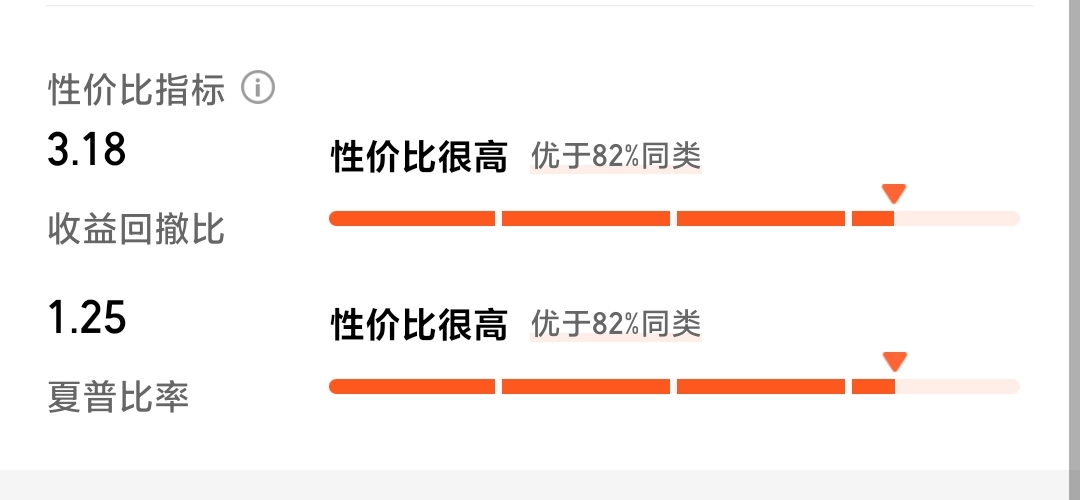 当然了,除了业绩这个重要的指标之外还有一些性价比指标可以对比看一下,在近一年的数据当中,该基金的夏普比率为1.25%,超越82%的同类。相对来说,这支基金持有起来会比较省心,因为是FOF整个的风险被分散的比较充分。