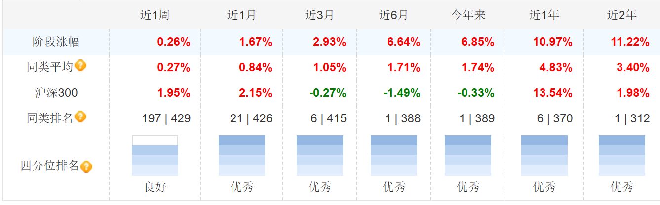 近一周上涨0.26%,近1月上涨1.67%,近3月涨2.93%,近6月涨6.64%,今年来涨6.85%,近一年涨10.97%,近2年涨11.22%。不知道这样的业绩表现大家是否满意呢,作为稳健类的资产来说,我认为能够多个周期之内稳步增长,甚至年收益高达10%,这已经是非常了不起的数据了。不过也难怪,这是同类排名靠前的一个,可以看到近6月、近一年以及近两年的4分位排名全都是同类第一。