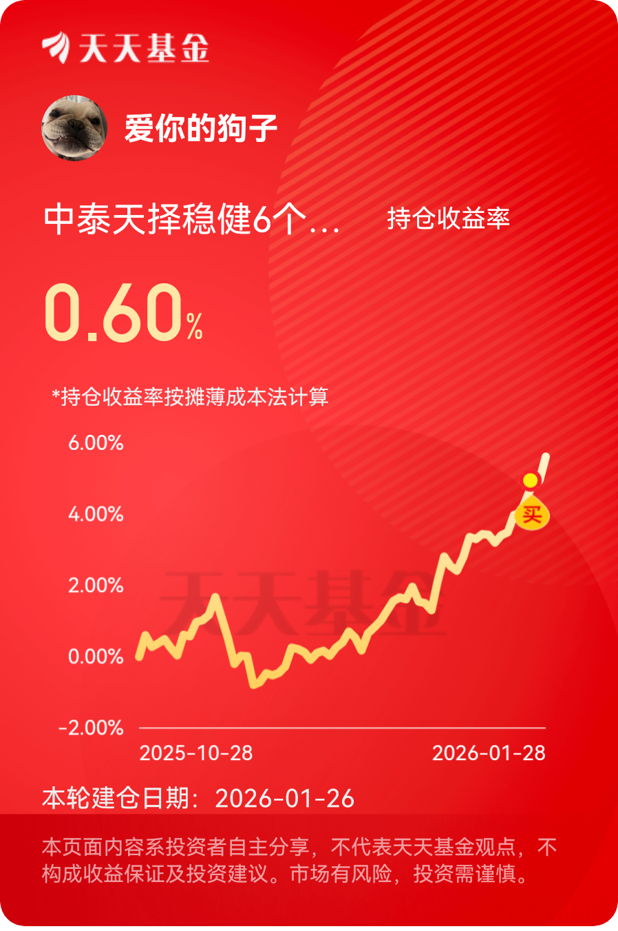 #晒收益# 黄金大跌,估计下周$中泰天择稳健6个月持有混合(FOF)A$ 也会下跌,一进来就要挨打了。