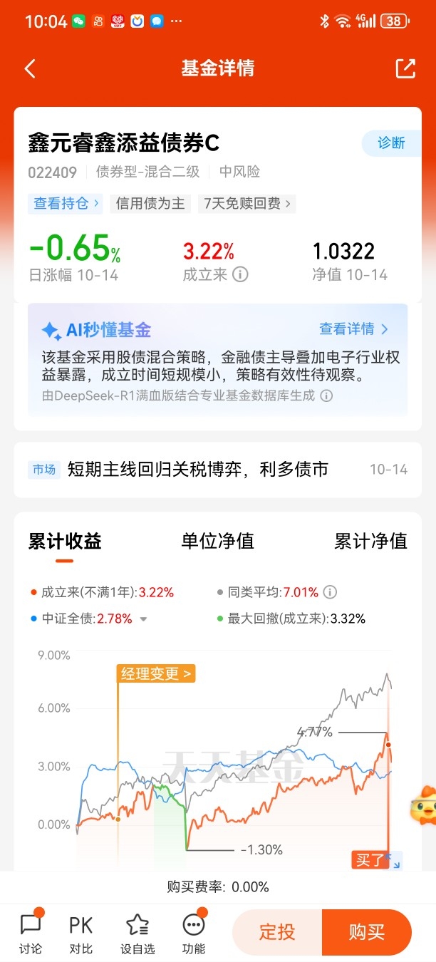 债基加油,鑫元睿鑫添益债成立来收益322个蛋,风险控制的还不错,继续加油