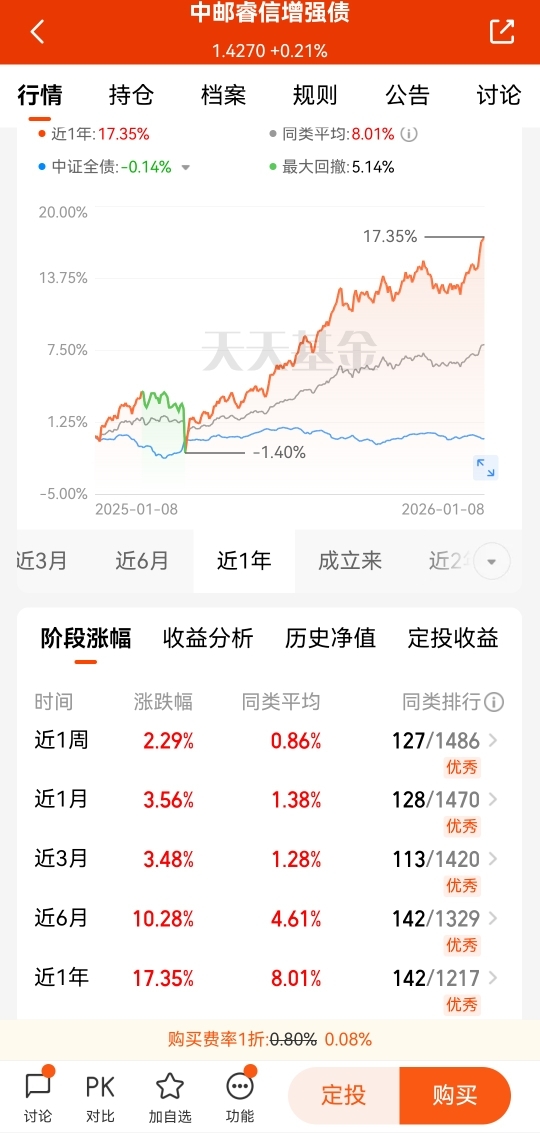 看见了$中邮睿信增强债$一年下蛋1735个,可转债,信用债投资不错的,而且一直比