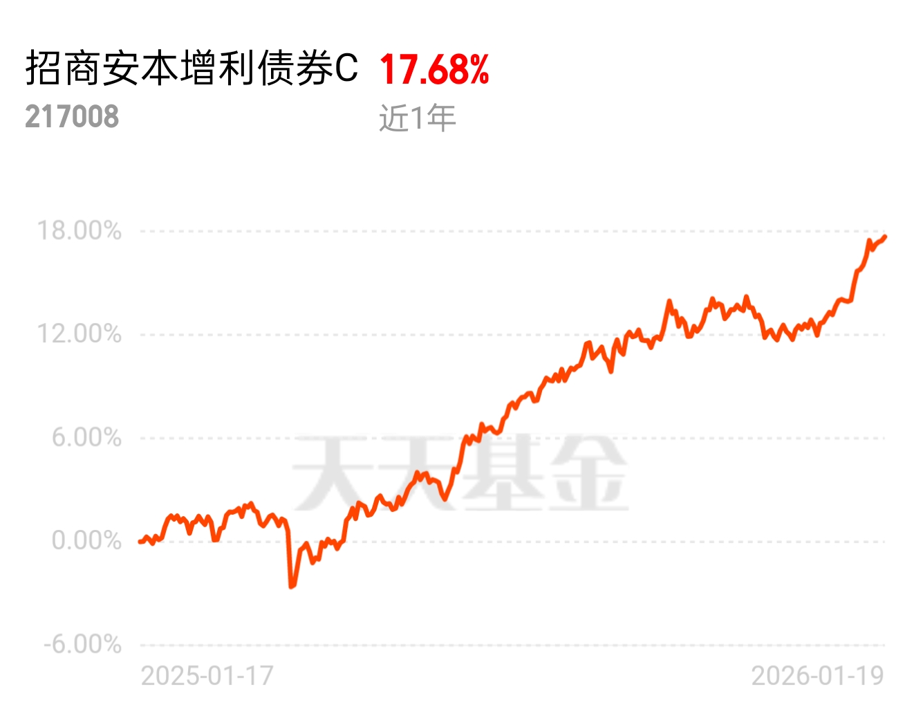 最近理财市场主打一个 “稳” 字,债基热度持续上升。招商安本增利债券 C 表现亮眼,近 1 年 17.68% 的收益很能打,风险低还省心,闲钱放这儿不用操心,稳稳积累财富超靠谱。$招商安本增利债券C$