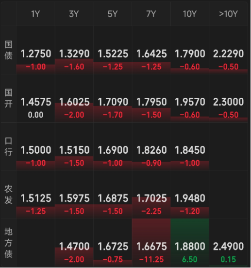 债市今天持续释放暖意!目前十年期国债活跃券收益率下行至1.79,利率债全面上涨,且涨幅相较前两天有所扩大。信用债和存单也是涨多跌少,国债期货局部回调,好在幅度并不大。期限利差反弹。
