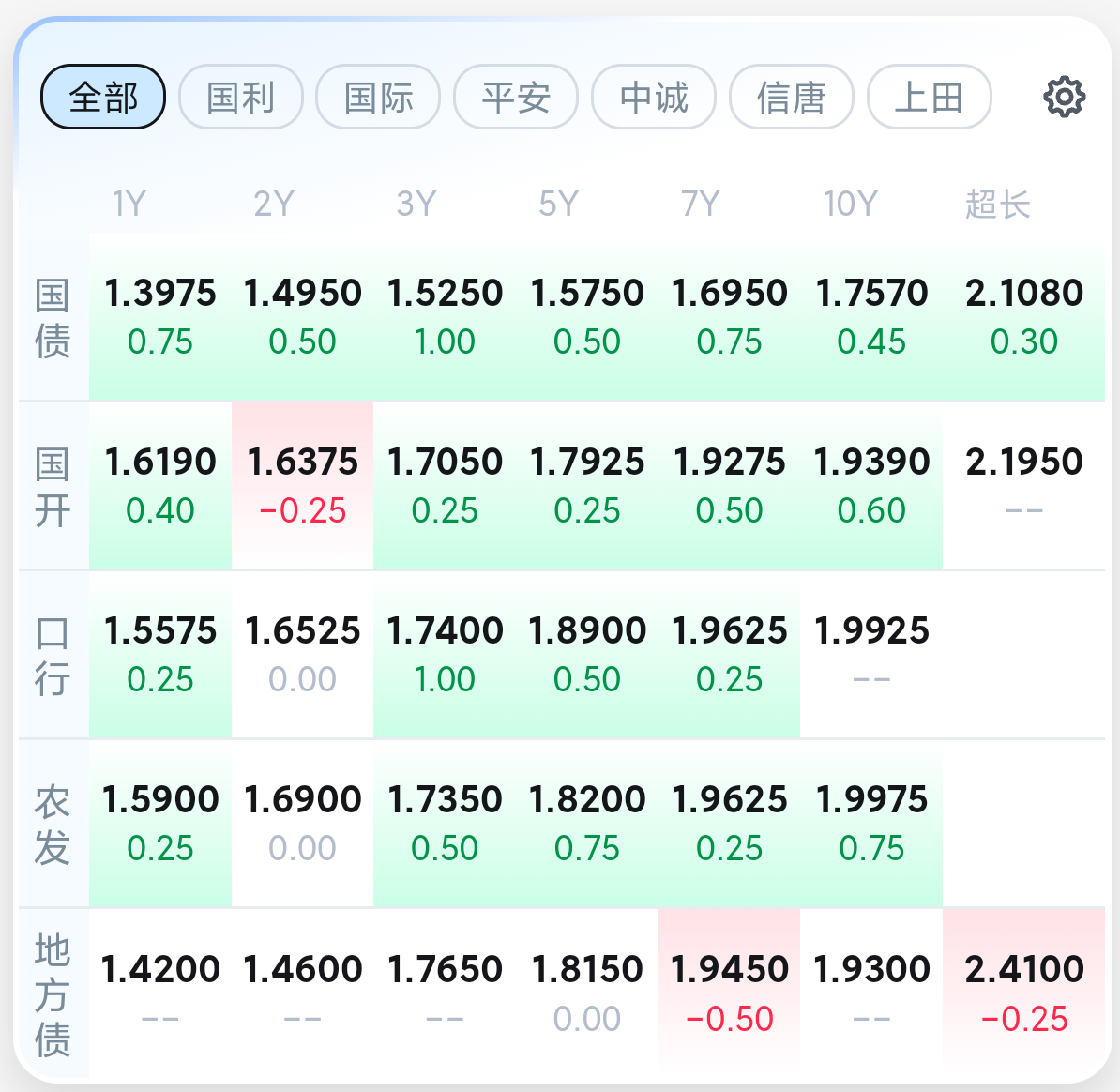今日股债跷跷板效应继续上演,股市走强压制债市情绪,当前市场对基本面数据仍较为钝化,经济温和修复中,9月社融数据公布后,银行间主要利率债收益率变动不大