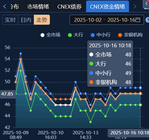 DR001报1.30%左右,DR007报1.41%左右,资金情绪偏松(CNEX资金面情绪指数在48)