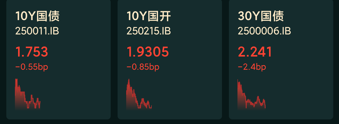 十年期国债收益率:1.753%,-0.55BP(国债收益率越跌,债市越涨)