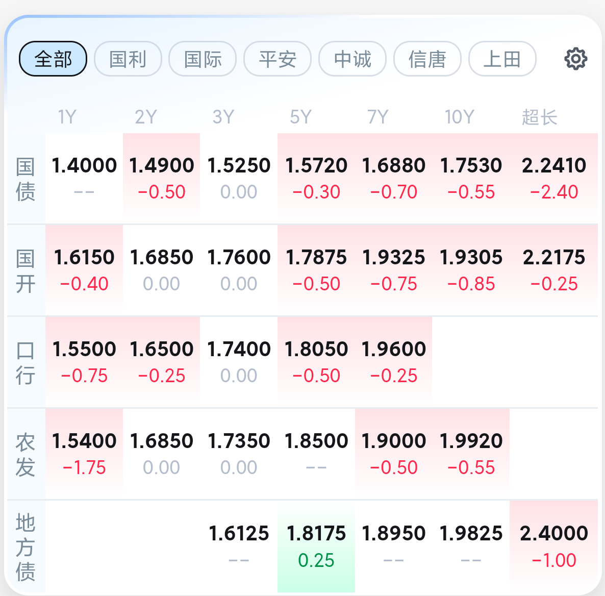 今日资金面维持宽松,昨日又有小作文所说基金免赎回费周期从6个月降至1个月,权益市场三大指数小幅上涨,股债跷跷板效应不强,债市小幅修复,银行间主要利率债收益率多数下行,信用债也维持晴天。