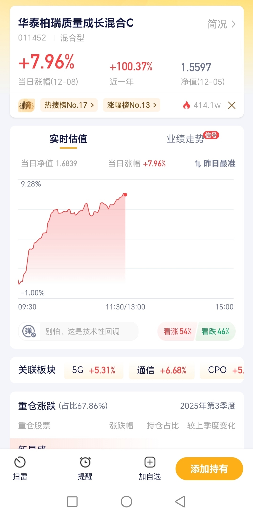 今天科技圈可算“支棱”起来了!CPO、半导体、存储芯片这些之前跌得让人揪心的板块,全在往上冲——尤其是CPO,这弹性真没话说,之前回调快得像坐滑梯,今天直接反弹起飞。正好刷到华泰柏瑞,实时估值一下涨了快8个点,近一年都翻倍了,刚好踩中了这波CPO的风口。它重仓的就是这些科技赛道,不用咱自己盯个股、猜节奏,买它相当于搭了科技行情的顺风车,适合想蹭热度又怕踩坑的普通人~$华泰柏瑞质量成长C$ #券商行业迎利好:杠杆上限“松绑”#