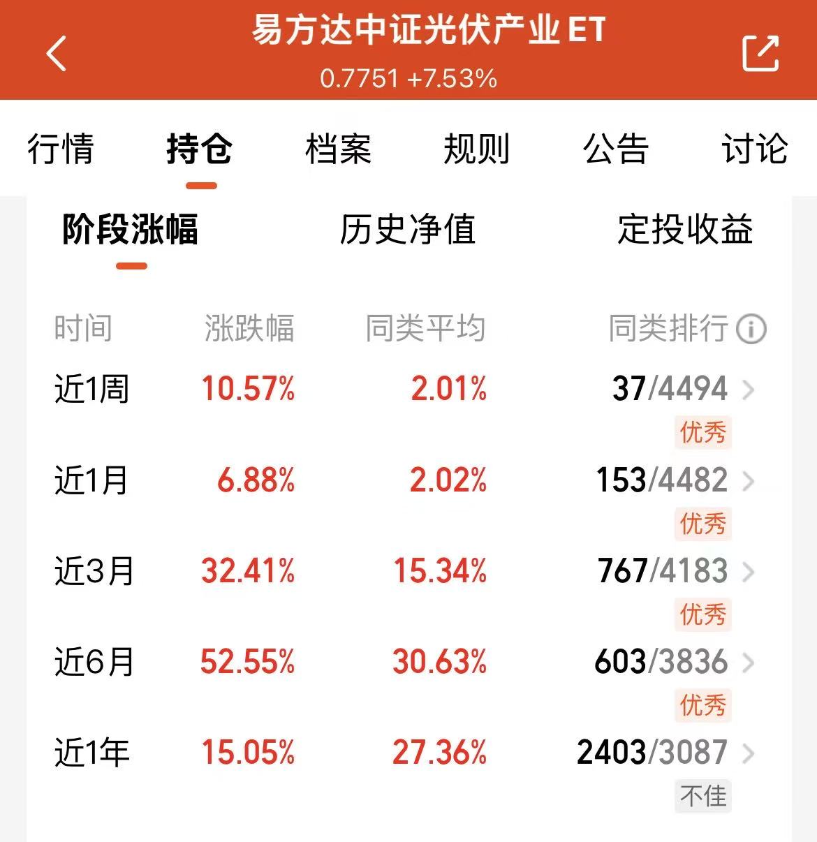 今天A股高开高走,上涨的个股也是比较多的,光伏方向迎来大反弹,$易方达中证光伏产业ETF联接发起式A(OTCFUND|017646)$今天上涨7.53%,近一周涨幅10.57%,近三个月涨幅32.41%,近一年涨幅52.55%,业绩出色,重仓涵盖光伏全产业链龙头,有隆基绿能,通威股份,晶科能源等,我觉得未来发展空间也是非常广阔的,我继续看好向上趋势!