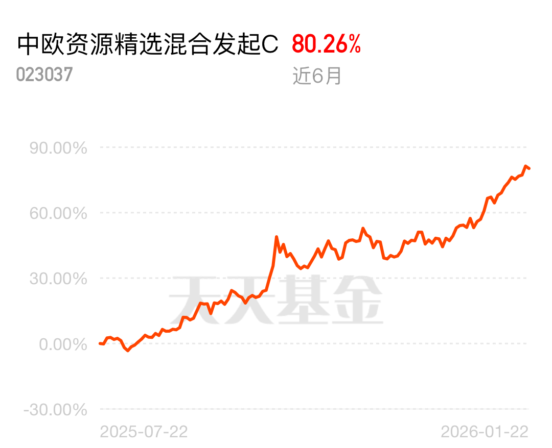 1 月 22 日现货金价冲过 4900 美元,地缘风险不断,多国央行持续入手黄金,美联储政策要调整,美元信用遇危机,避险需求大爆发,机构看涨金价至 5000,有色金属高景气延续,今日低吸好时机,中欧资源精选混合发起 C 近 6 月 80.26%,赶紧跟上$中欧资源精选混合发起C$